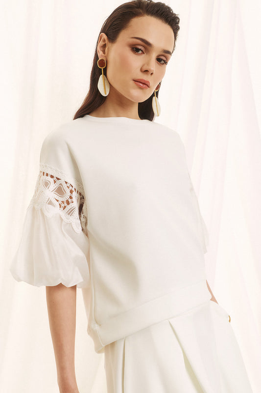 Figaro - Λευκή Μπλούζα με Balloon Μανίκια & Δαντέλα