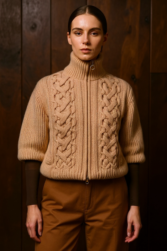 Tailor Made - Πλεκτό Ζιβάγκο Κοντό Μπουφάν με Φερμουάρ & Έντονη Πλέξη Μπεζ