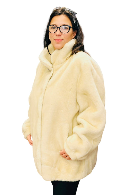 Charizma - Συνθετική Γούνα με Ψηλό Γιακά, Τσέπες & Στρασένιο Κουμπί στον Λαιμό Μπεζ