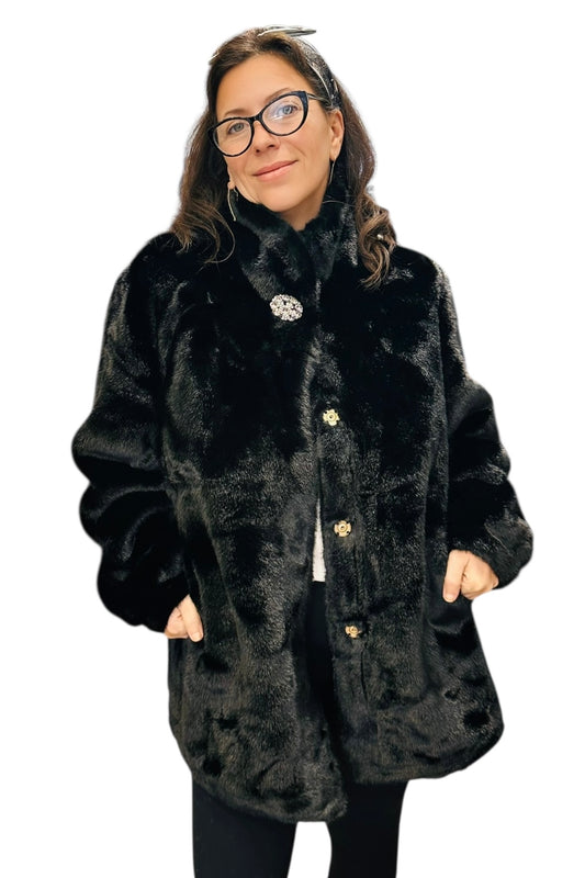 Charizma - Συνθετική Γούνα με Ψηλό Γιακά, Τσέπες & Στρασένιο Κουμπί στον Λαιμό Μαύρη