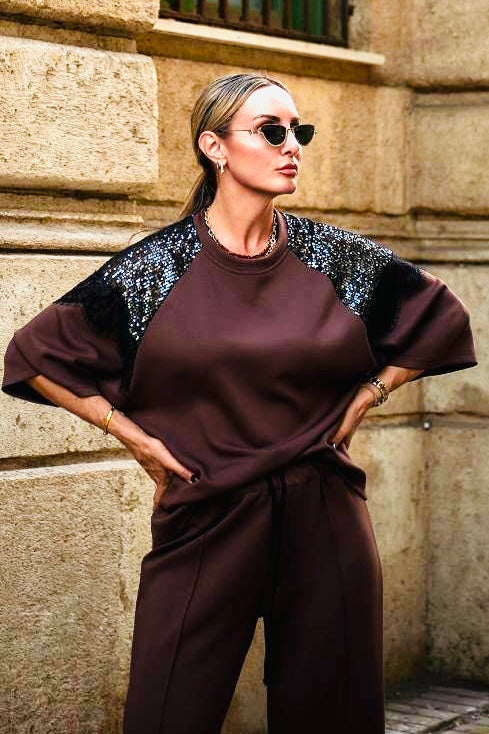 Figaro - Μπλούζα με Δαντέλα & Παγιέτα στους Ώμους Καφέ