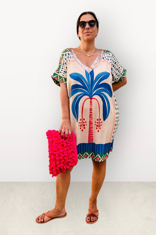 Charizma - Boho Glam Αέρινο Μίνι Φόρεμα με V και Παγιέτες Palm Trees