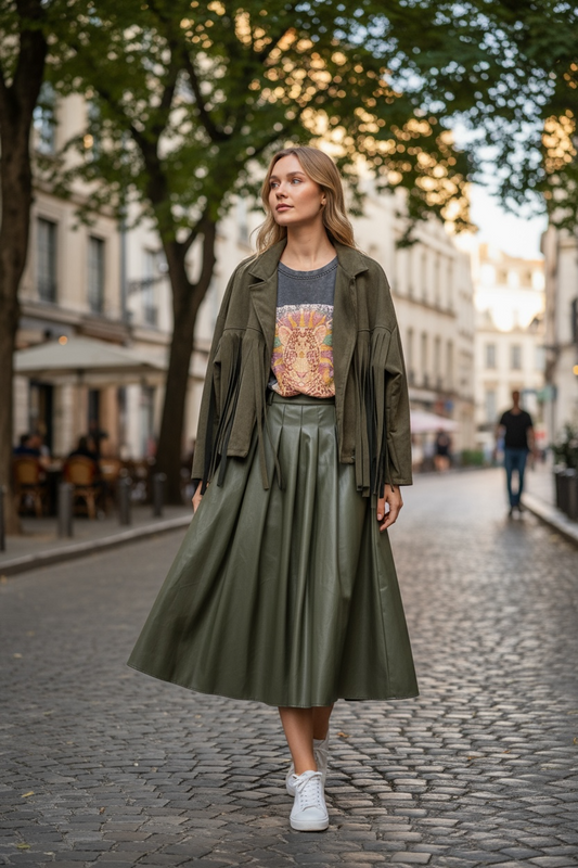 Charizma - Δερματίνη Φούστα με Πιέτες Χακί