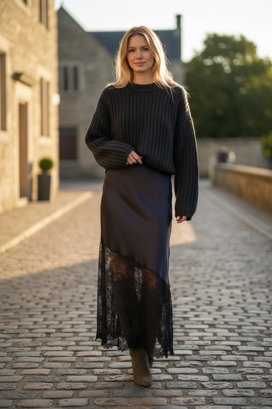 Charizma - Σατέν Μακριά Φούστα με Δαντέλα Διαγώνια στο Τελείωμα Μαύρη