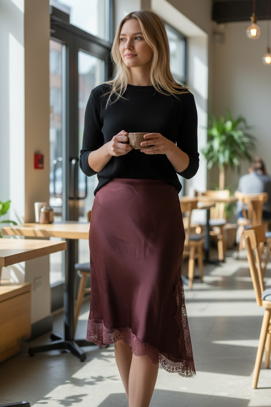 Charizma - Φούστα Σατέν Με Δαντέλα Και Σκίσιμο Καφέ