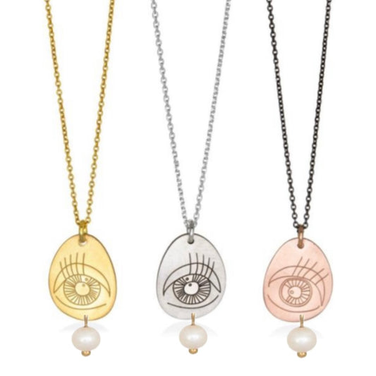 Pavlina Verouki Classic Eyes - Ασημένιο Κολιέ Μικρό Βότσαλο Μάτι κ Μαργαριτάρι Χρυσό & Μαύρη Αλυσίδα