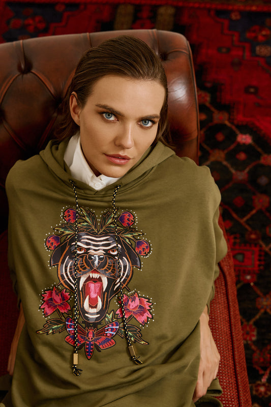 Eighty2 by Figaro - Φούτερ Oversized Χακί με Τύπωμα Τίγρη και Λουλούδια
