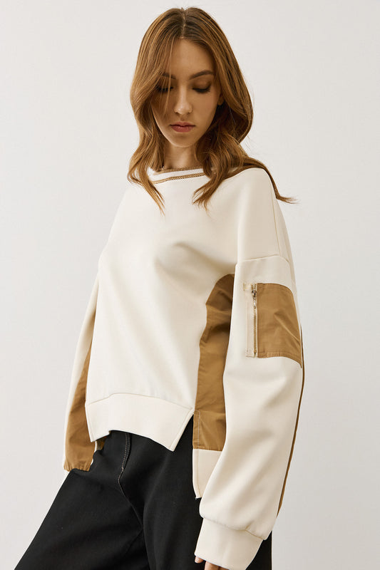 Figaro - Μπλούζα Φούτερ με Διχρωμία & Λεπτομέρεια Τσέπης στο Μανίκι Μπεζ