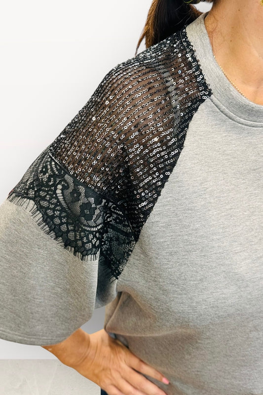 Figaro - Μπλούζα με Δαντέλα & Παγιέτα στους Ώμους Γκρι