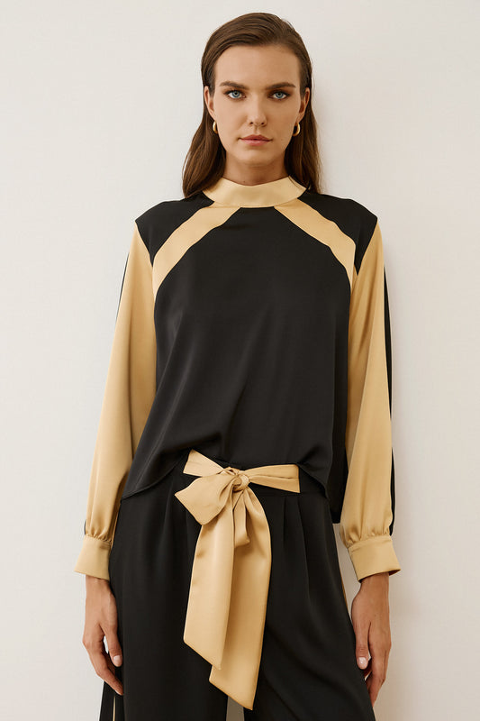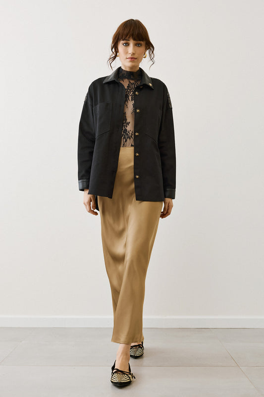 Figaro - Σατέν Πουκάμισο Μαύρο με Μπεζ Λεπτομέρειες