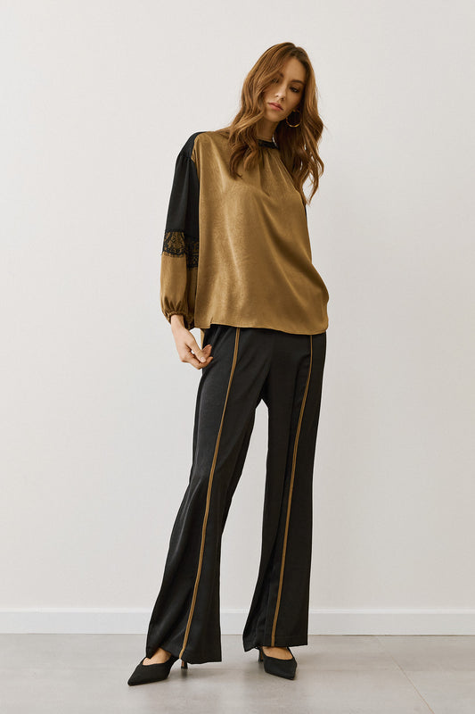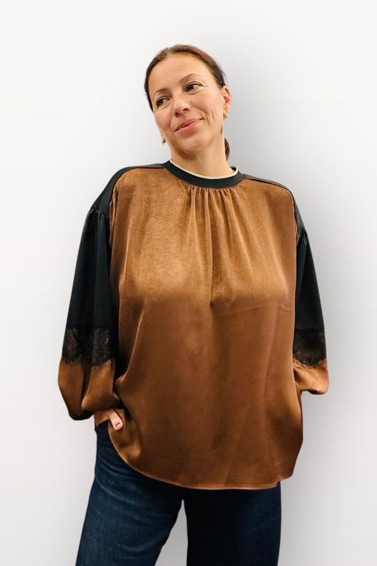 Figaro - Καφέ Μπλούζα με Παγιέτες Με Μαύρη Δαντέλα