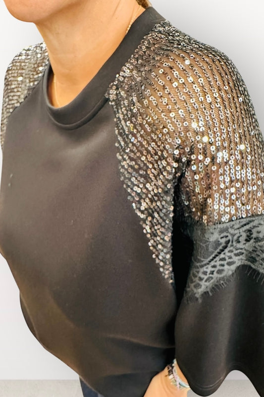 Figaro - Μπλούζα με Δαντέλα & Παγιέτα στους Ώμους Μαύρη