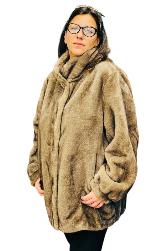 • Charizma - Συνθετική Γούνα με Ψηλό Γιακά, Τσέπες & Στρασένιο Κουμπί στον Λαιμό Μπεζ