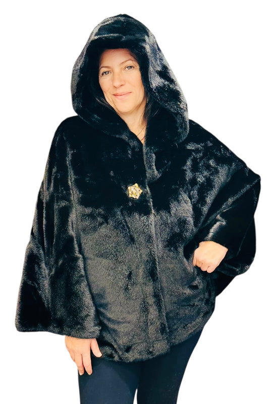 Charizma - Συνθετική Γούνα με Κουκούλα, Τσέπες σε Στυλ Κάπας Μαύρη