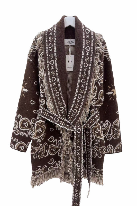 Orlinn - Ζακέτα Παλτό Boho Chic με Κρόσσια & Ζώνη Καφέ