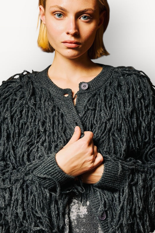 Tailor Made - Boho Touch Κοντή Πλεκτή Ζακέτα με Κρόσσια Γκρι