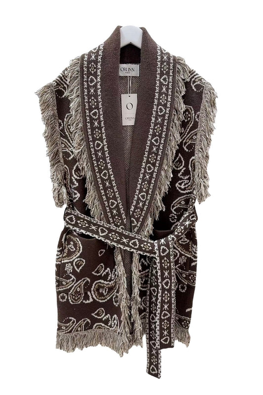 Orlinn - Αμάνικη Ζακέτα Boho Chic με Κρόσσια & Ζώνη Καφέ