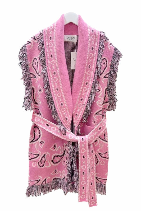 Orlinn - Αμάνικη Ζακέτα Boho Chic με Κρόσσια & Ζώνη Ροζ