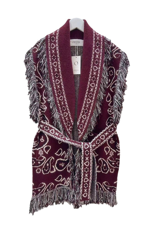 Orlinn - Αμάνικη Ζακέτα Boho Chic με Κρόσσια & Ζώνη Μπορντό