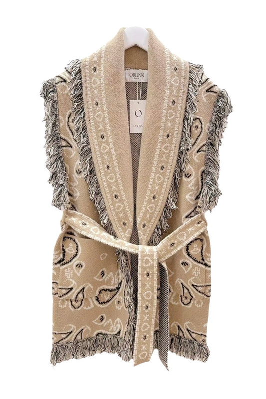 Orlinn - Αμάνικη Ζακέτα Boho Chic με Κρόσσια & Ζώνη Μπεζ