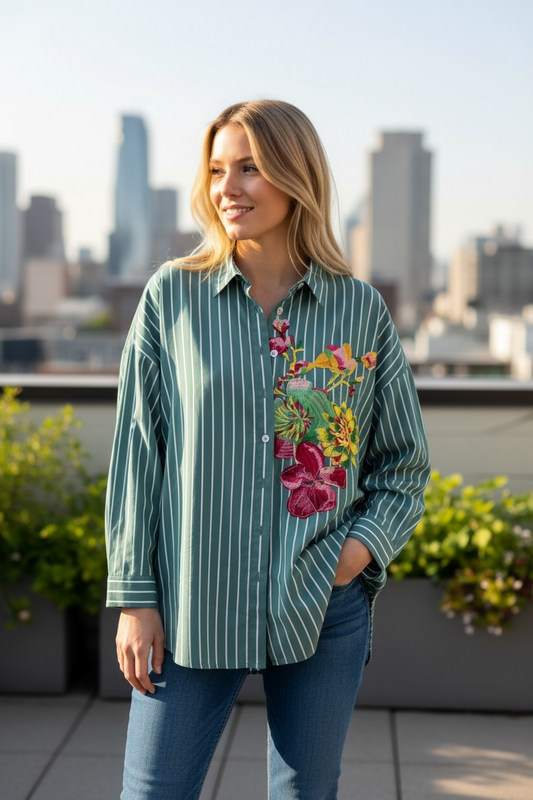 ANLYTA - Πουκάμισο Πετρολ Ριγέ Oversized Με Κέντημα