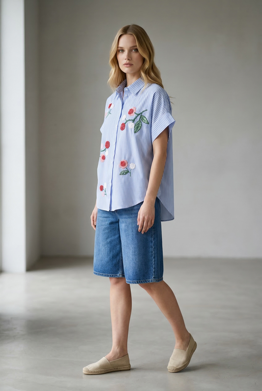 Charizma - Oversized Ριγέ Πουκάμισο με κέντηματα floral Γαλάζιο