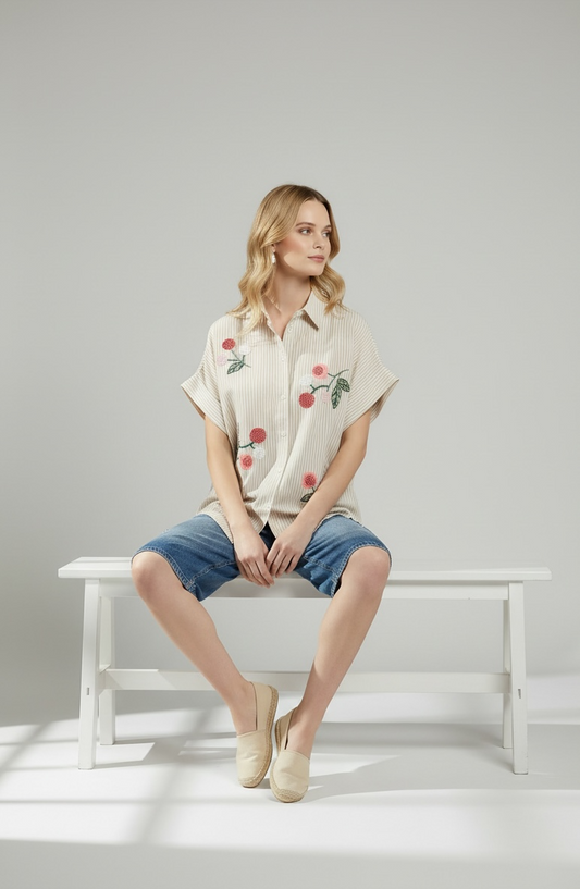 Charizma - Oversized Ριγέ Πουκάμισο με κέντηματα floral Μπεζ