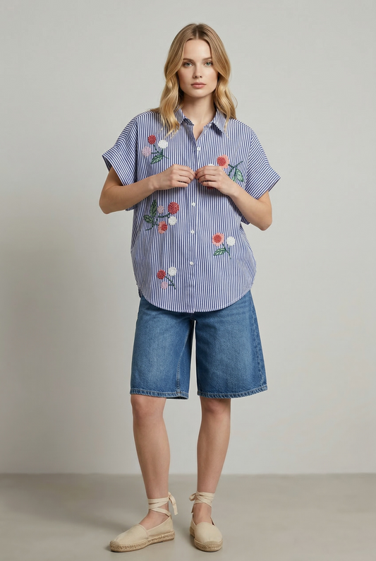 Charizma - Oversized Ριγέ Πουκάμισο με κέντηματα floral Μπλε