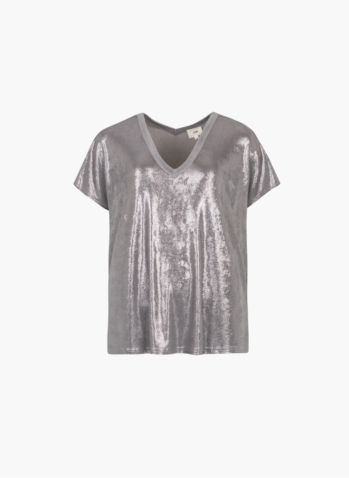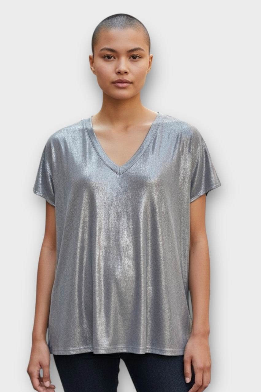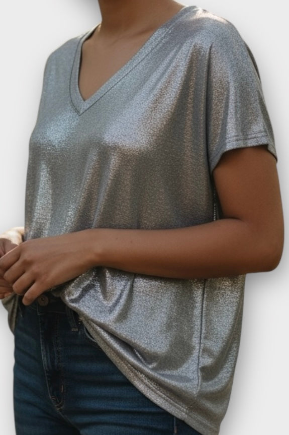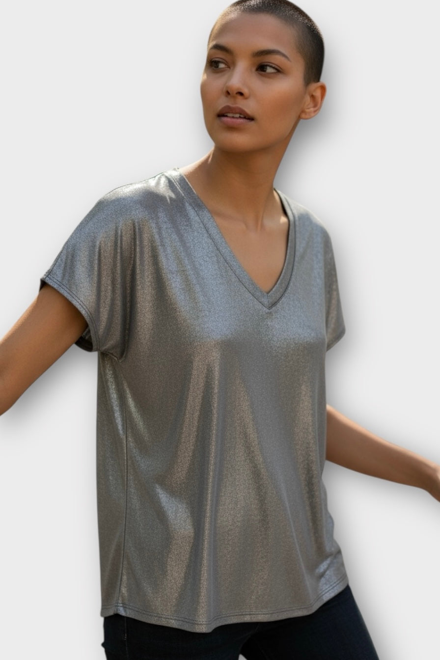 An'ge Agnez- Γυναικείο Γυαλιστερό Μπλουζάκι με V Λαιμόκοψη Ασημί