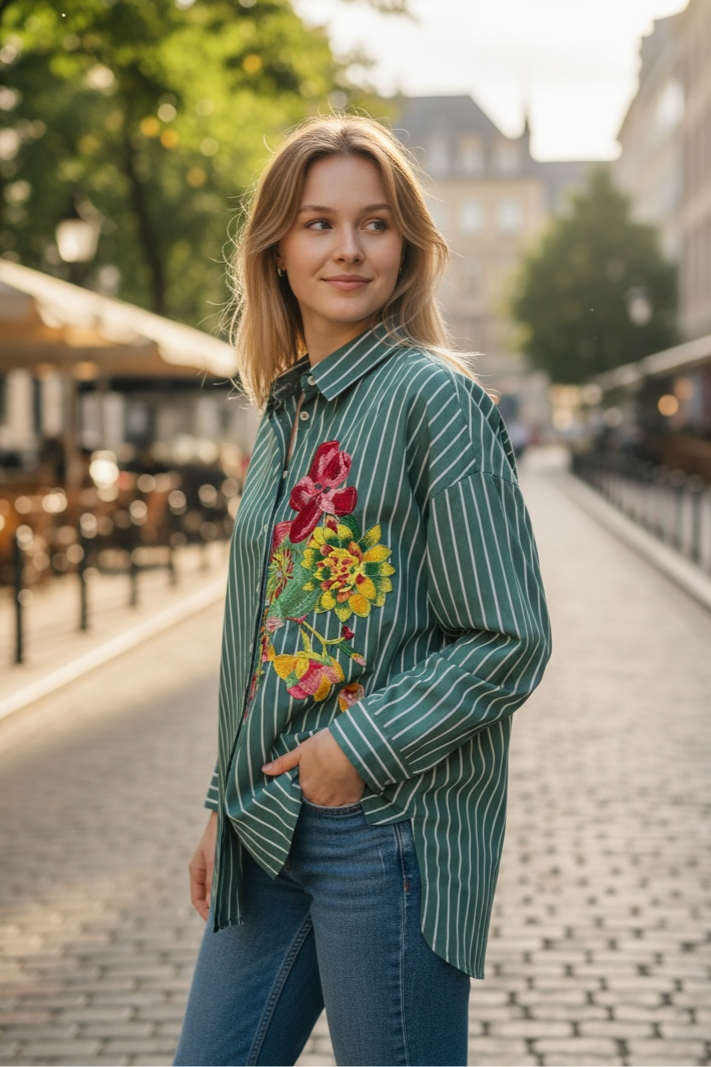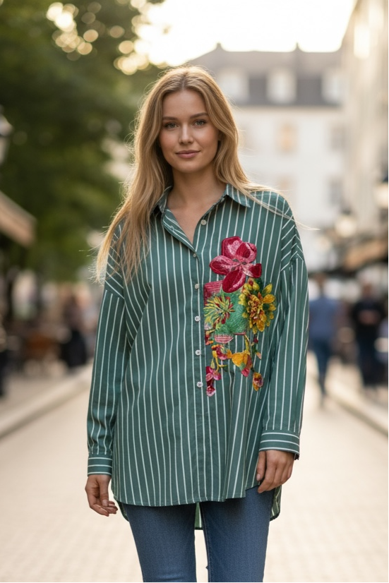 Ανανεώστε το στυλ σας με αυτό το κομψό oversized πουκάμισο με ρίγες. Διαθέτει κλασικό γιακά, μακριά μανίκια με φαρδιές μανσέτες και κουμπιά, καθώς και κρυφό κούμπωμα πατιλετα στο μπροστινό μέρος για ένα minimal και καθαρό look. Το μοναδικό σχέδιο με τα λουλούδια προσδίδει μια νότα ρομαντισμού στο αυστηρό ριγέ. Το ελαφρώς μακρύτερο πίσω μέρος προσφέρει μοντέρνα εφαρμογή και άνεση. One & Only by A.