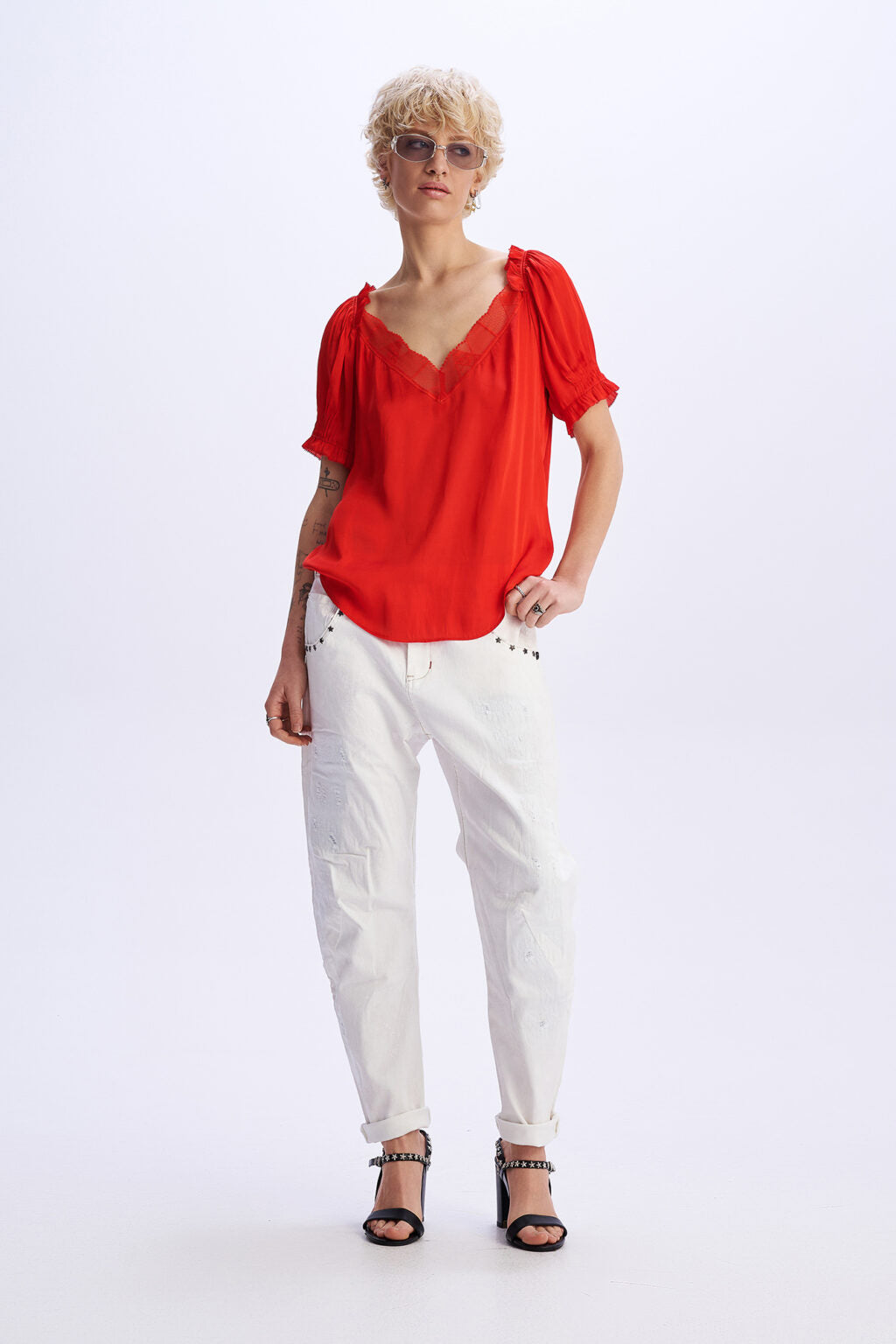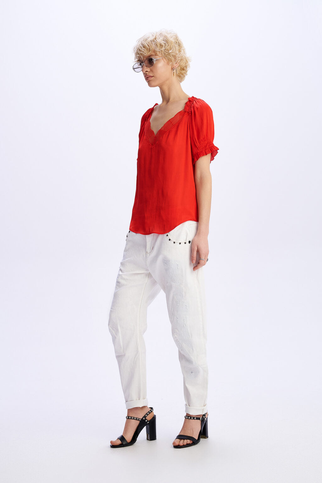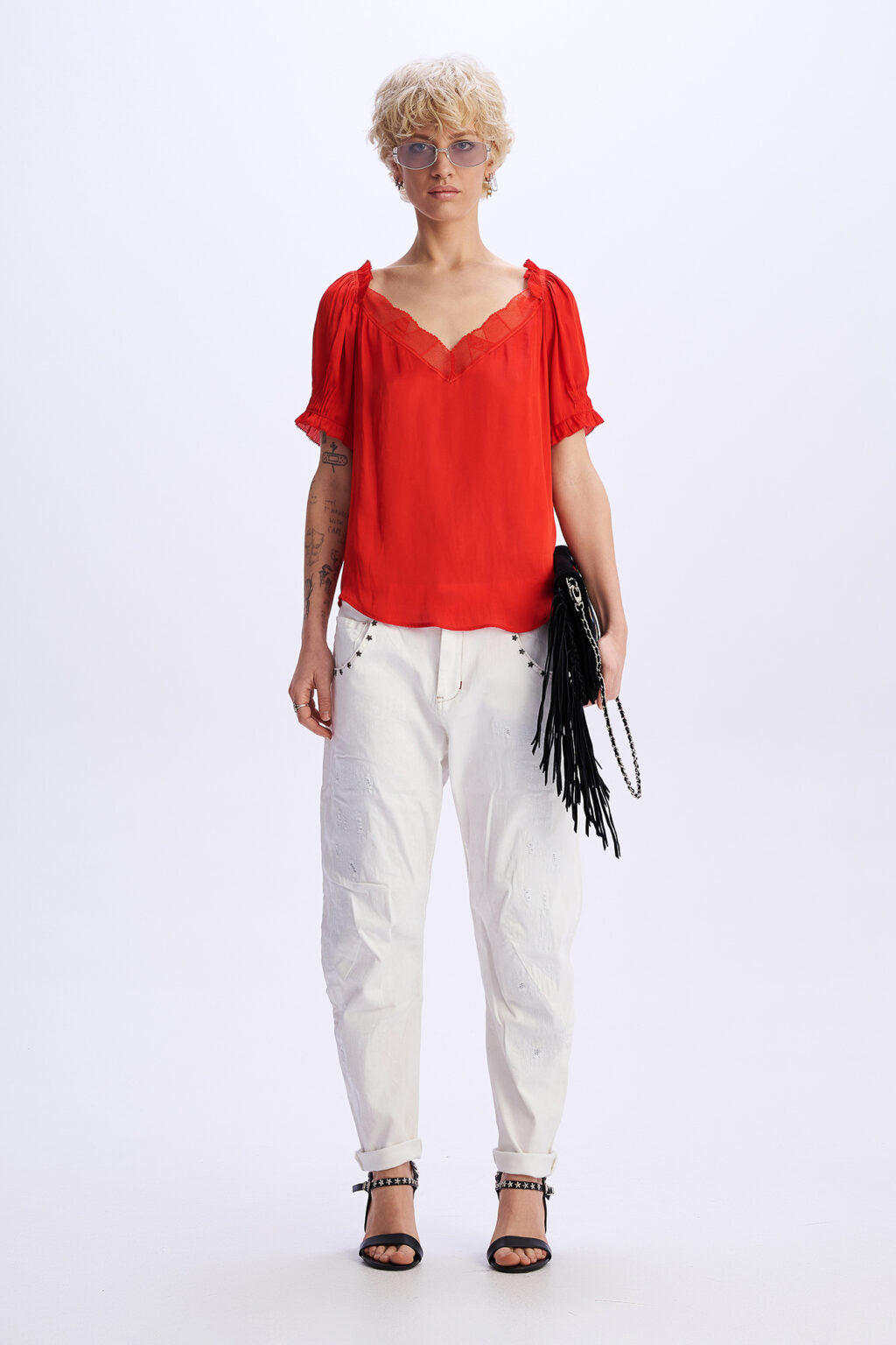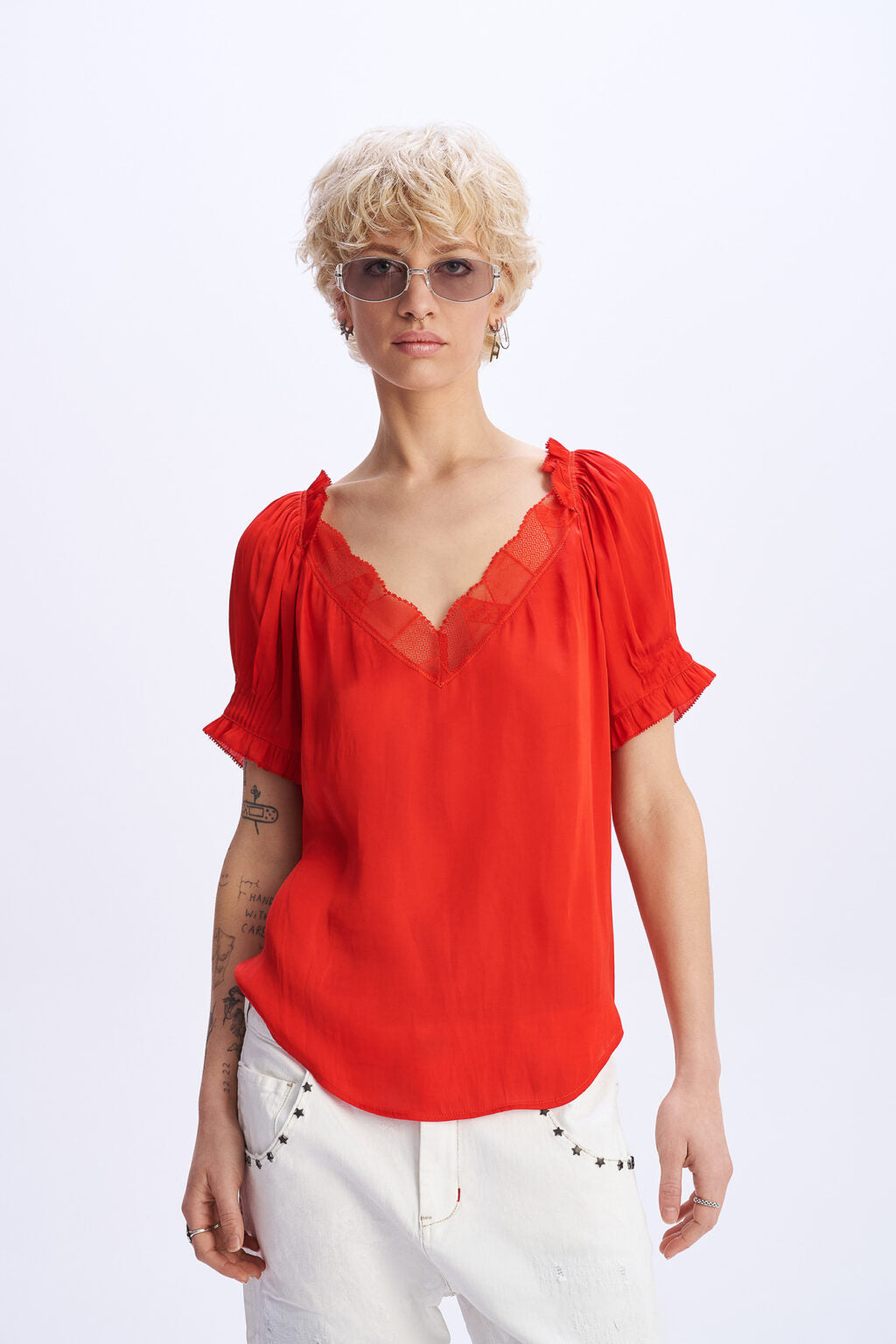 Αβίαστα θηλυκό, αυτό το κομψό τοπ διαθέτει κλασική λαιμόκοψη και φουσκωτά κοντά μανίκια με λεπτομέρειες από δαντέλα στον ίδιο τόνο και λαιμόκοψη με βολάν. Αυτό το silky σατέν μπλουζάκι μπορεί να φορεθεί σε οποιαδήποτε έξοδο συνδυάζοντάς το κατάλληλα, για επίσημες αλλά και πιο casual περιστάσεις.