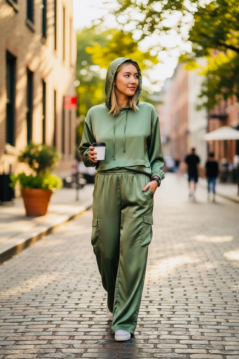Αναβαθμίστε τις casual εμφανίσεις σας με αυτό το σετ σατέν που συνδυάζει κομψότητα και άνεση. Η μπλούζα με κουκούλα και κορδόνι διαθέτει μακρύ μανίκι και άνετη γραμμή, προσφέροντας χαλαρή εφαρμογή με στυλ. Η φαρδιά παντελόνα με λάστιχο στη μέση αγκαλιάζει άνετα τη μέση και διαθέτει εξωτερικές τσέπες, ιδανική για καθημερινή άνεση χωρίς να χάνει τη φινέτσα. Ένα σετ που συνδυάζει κομψό σατέν, λειτουργικότητα και άνεση, κατάλληλο για χαλαρές βόλτες, καφέ ή στιγμές χαλάρωσης στο σπίτι με στυλ.
