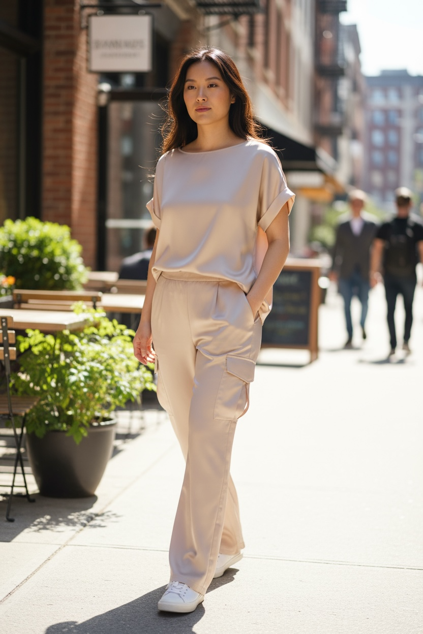 Αναβαθμίστε τις casual εμφανίσεις σας με αυτό το σετ σατέν που συνδυάζει κομψότητα και άνεση. Η μπλούζα με κοντό μανίκι και λαιμόκοψη προσφέρει χαλαρή εφαρμογή με στυλ, ιδανική για κάθε στιγμή της μέρας. Η φαρδιά παντελόνα με λάστιχο στη μέση αγκαλιάζει άνετα τη μέση και διαθέτει εξωτερικές τσέπες, συνδυάζοντας πρακτικότητα και κομψότητα. Ένα σετ που ενώνει πολυτελές σατέν, άνεση και στυλ, κατάλληλο για χαλαρές βόλτες, καφέ ή στιγμές χαλάρωσης με φινέτσα.