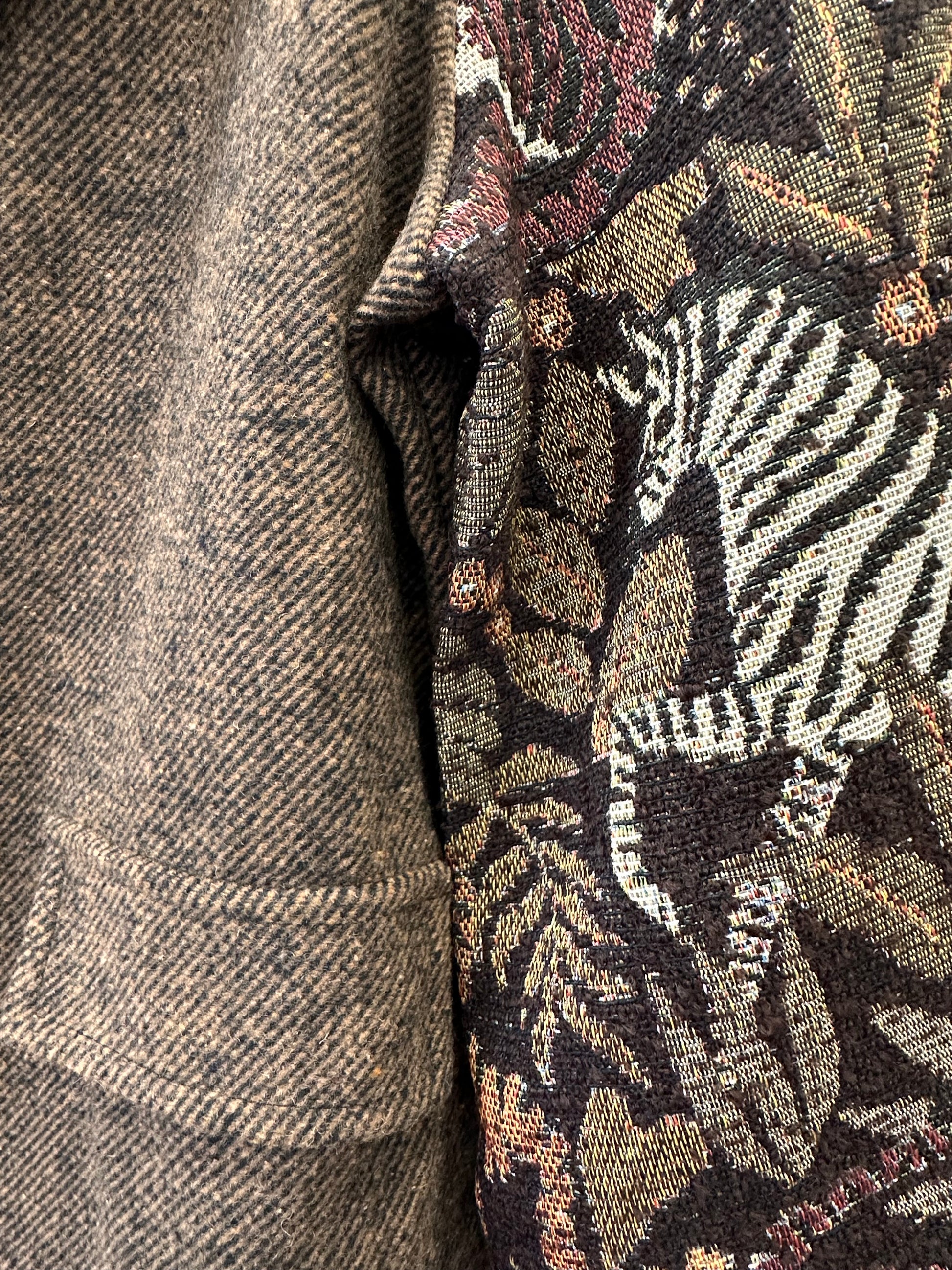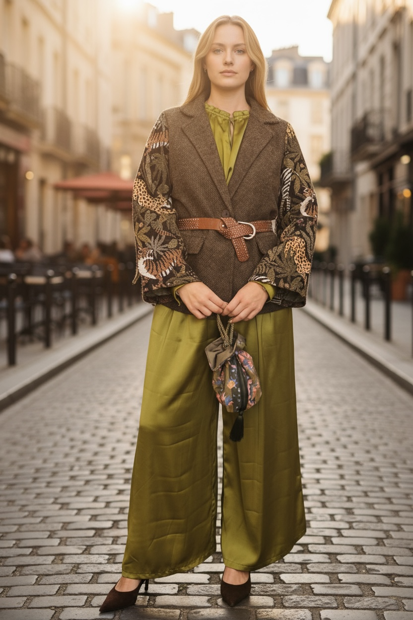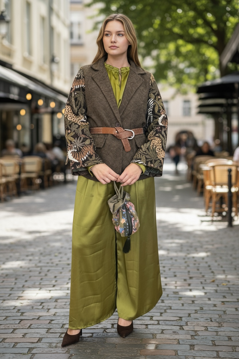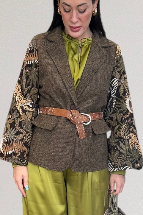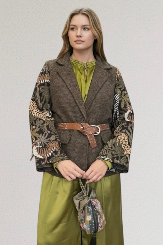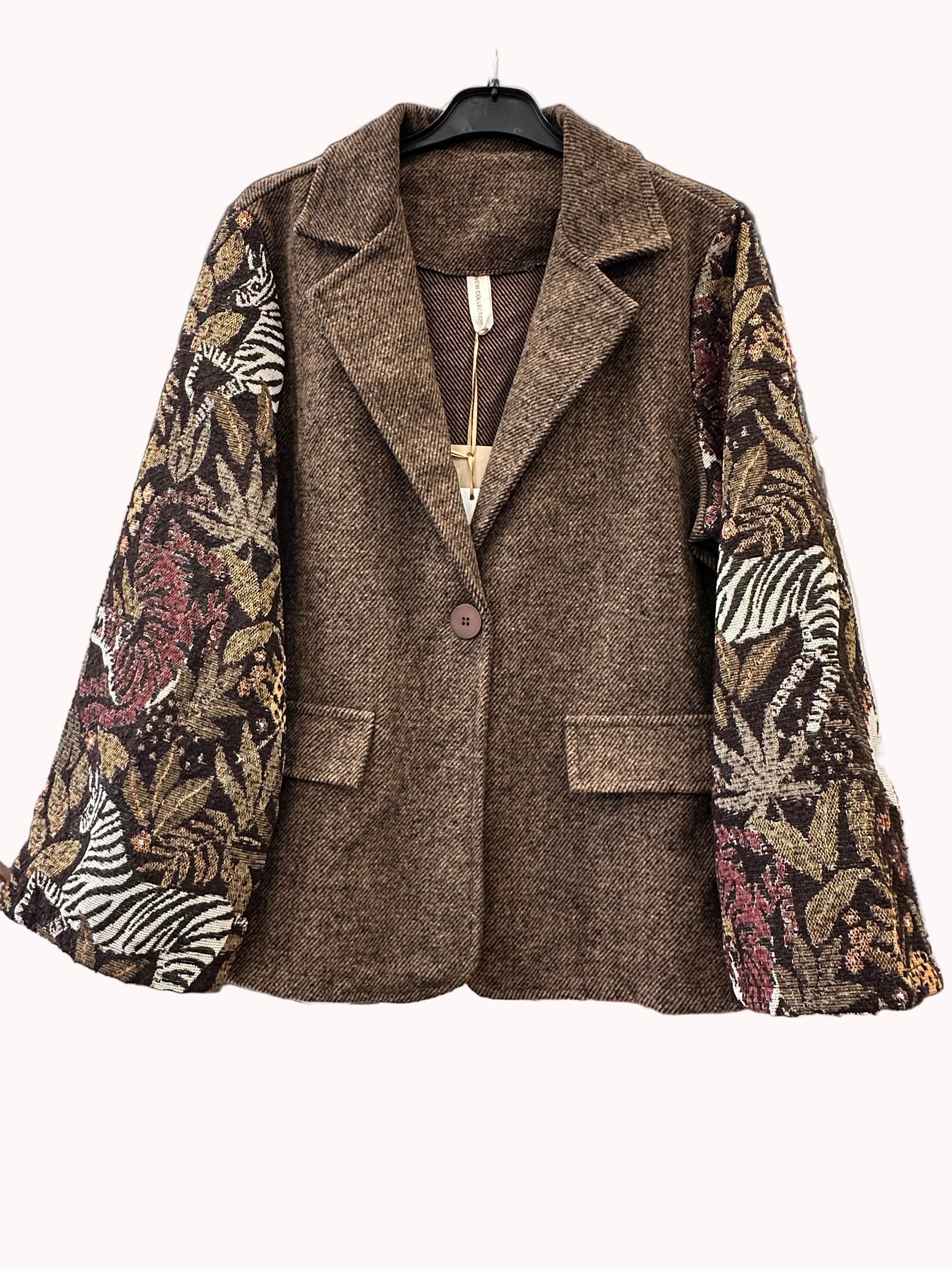 Αυτό το καφέ σακάκι αποπνέει κομψότητα και μοναδικό χαρακτήρα, χάρη στα εντυπωσιακά μανίκια από μπροκάρ. Το πλούσιο ανάγλυφο ύφασμα των μανικιών προσδίδει διαχρονική πολυτέλεια και αισθητική υψηλής ραπτικής. Στο μπροστινό μέρος του σακακιού υπάρχουν διακοσμητικές τσέπες που προσθέτουν μια πρακτική αλλά και στυλάτη λεπτομέρεια, ενώ το κλείσιμο περιορίζεται σε ένα μόνο κουμπί, προσφέροντας μίνιμαλ γραμμή και ευέλικτη εφαρμογή. Η σιλουέτα είναι ευκολοφόρετη και μπορεί να συνδυαστεί εύκολα με ένα παντελόνι για πιο επίσημες εμφανίσεις ή με τζιν / φούστα για πιο casual look. Το σακάκι είναι ιδανικό για όσες αναζητούν μια διαχρονική δήλωση στυλ που συνδυάζει πολυτέλεια και λειτουργικότητα.