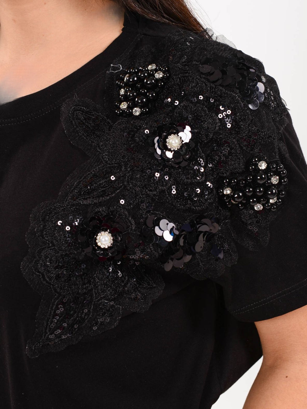 Το απόλυτο t-shirt φετίχ της φετινής χρονιάς συνδυάζει άνεση και στυλ με μια δόση ροκ αισθητικής. Με ρομαντικο κέντημα με δαντέλα, πούλιες, στρας και πέρλες, φοριέται ιδανικά με μακριές σατέν πλισέ φούστες που δίνουν αέρινη κίνηση και κομψότητα. Ολοκληρώνεται τέλεια με μακριές ζακέτες για πιο χαλαρό look ή τζιν μπουφάν που προσθέτει μια wild rock but romantic πινελιά, κάνοντας το σύνολο απόλυτα σικ και γεμάτο προσωπικότητα.
