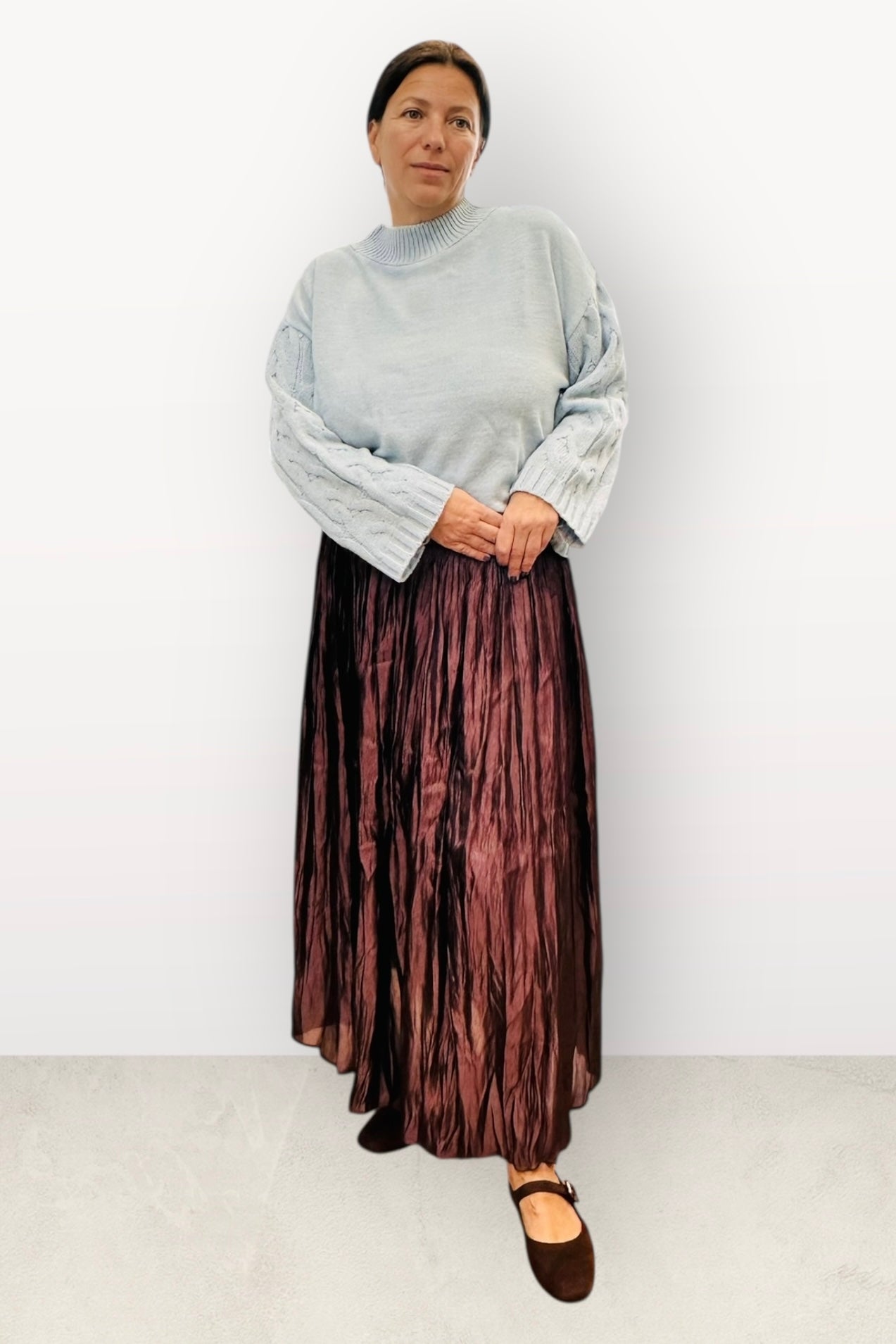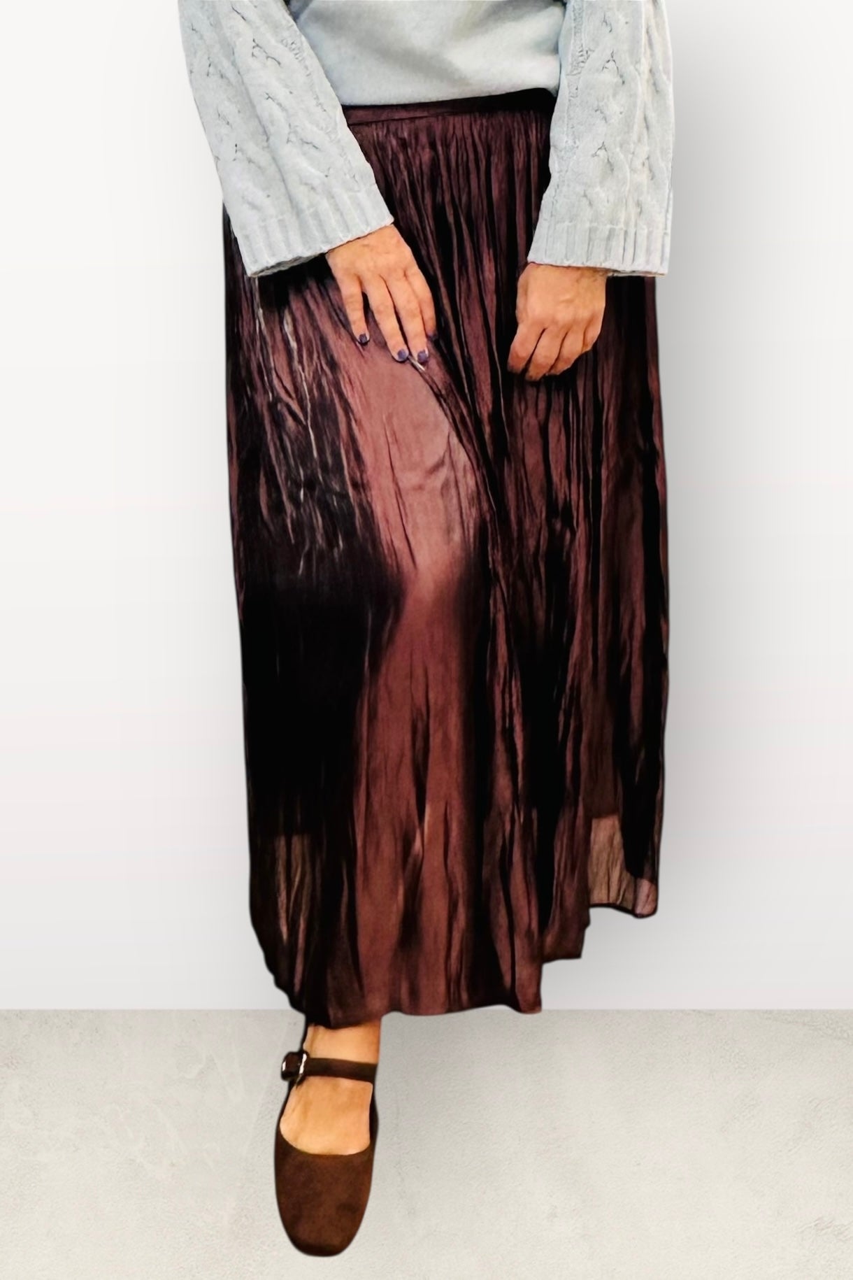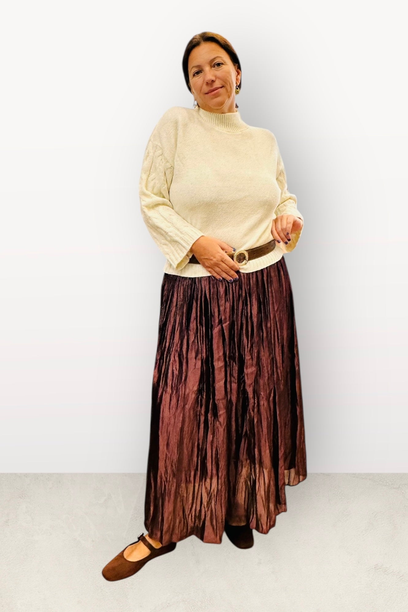 Κάνε τη διαφορά με αυτή την εντυπωσιακή πλισέ φούστα που συνδυάζει την κομψότητα με μια μοντέρνα, λαμπερή πινελιά. Το μεταλιζέ ύφασμα χαρίζει λάμψη και κίνηση, αναδεικνύοντας κάθε σου βήμα — ιδανική για τις μέρες (και τις νύχτες) που θέλεις να ξεχωρίζεις.