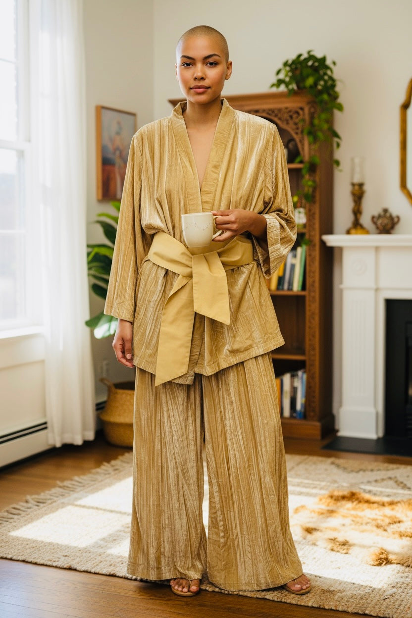 Αναδείξτε τη σιλουέτα σας με αυτό το πολυτελές σετ από βελούδο crushed velvet. Το σακάκι χωρίς κουμπιά αγκαλιάζει το σώμα με κομψότητα, ενώ η χοντρή ζώνη σατέν τονίζει τη μέση σας με μοναδικό στυλ. Η φαρδιά παντελόνα με ελαστική μέση προσφέρει άνεση και κίνηση, δημιουργώντας ένα σύνολο που συνδυάζει πολυτέλεια και χαλαρή κομψότητα. Ιδανικό για βραδινές εμφανίσεις ή ειδικές περιστάσεις όπου θέλετε να ξεχωρίσετε.