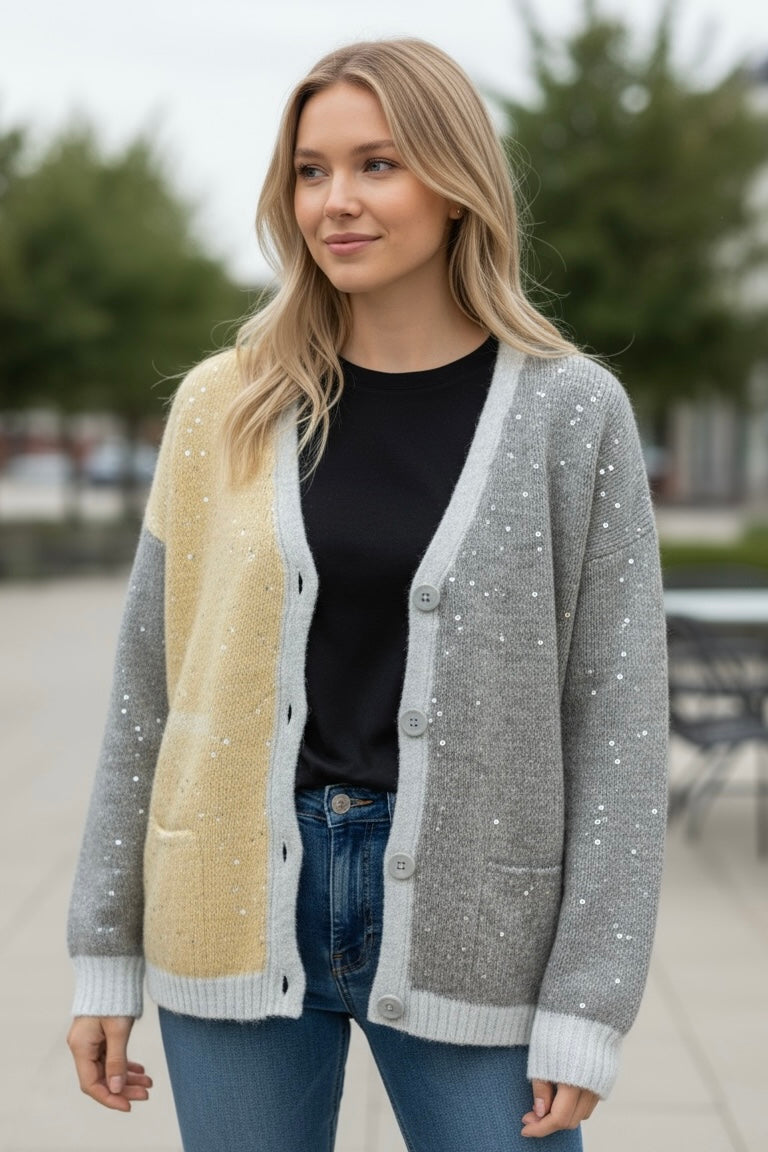 Αναδείξτε το στυλ σας με αυτό το εντυπωσιακό τρίχρωμο κοντό ζακετάκι, διακοσμημένο με λαμπερές παγιέτες που τραβούν όλα τα βλέμματα! Το παιχνιδιάρικο color blocking συνδυάζεται με τη λάμψη των παγιετών για ένα look που ξεχωρίζει, ιδανικό για βραδινές εξόδους ή ιδιαίτερες εμφανίσεις.
