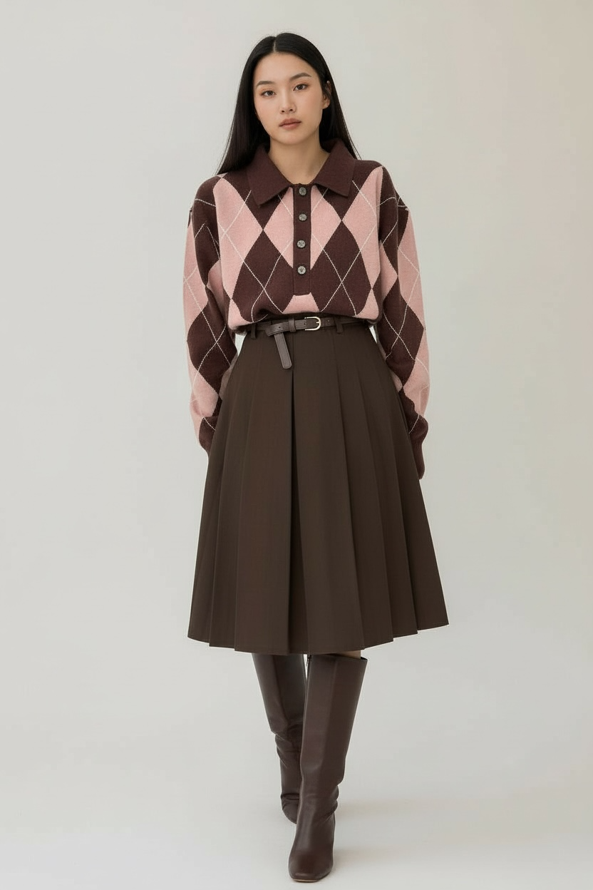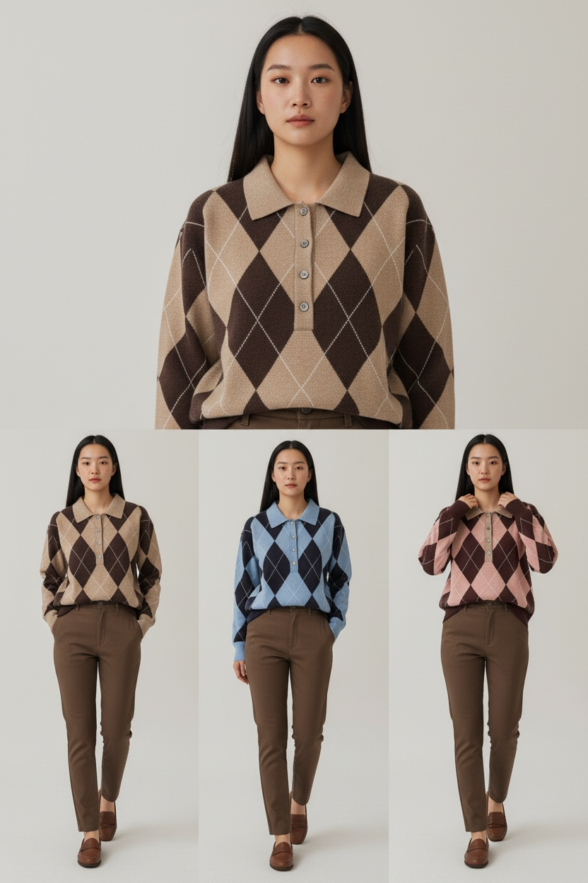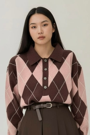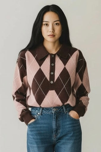 Κομψό πλεκτό μπλουζάκι με μακρύ μανίκι και διαχρονικό μοτίβο argyle σε όλη την επιφάνεια. Διαθέτει γιακά και πατιλέτα με κουμπιά στο μπροστινό μέρος, προσφέροντας ένα εκλεπτυσμένο αλλά άνετο ύφος. Η απαλή πλέξη του εξασφαλίζει ευχάριστη εφαρμογή, ενώ η κανονική γραμμή το καθιστά ιδανικό για καθημερινές αλλά και πιο προσεγμένες εμφανίσεις. Συνδυάζεται εύκολα με υφασμάτινα παντελόνια ή τζιν για ένα σύγχρονο και ισορροπημένο look.