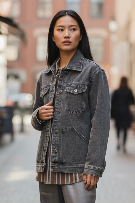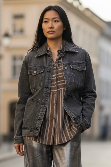 Με ιδιαίτερο σχεδιασμό που ξεχωρίζει, διαθέτει ασύμμετρες (στραβές) τσέπες στο στήθος και μεταλλικά κουμπιά σε όλο το μπροστινό μέρος. Το διαχρονικό denim αποκτά νέα διάσταση, προσφέροντας στιλ με χαρακτήρα.