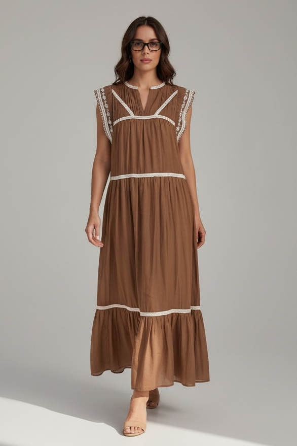 Αναδείξτε τη θηλυκότητά σας με αυτό το μακρύ ρομαντικό φόρεμα, ιδανικό για ξεχωριστές εμφανίσεις και ανοιξιάτικες–καλοκαιρινές βόλτες. Το αμάνικο σχέδιο αφήνει τους ώμους ελεύθερους, ενώ το λεπτομερές καφέ κέντημα λουλουδιών σε συνδυασμό με τη διακριτική δαντέλα προσθέτει vintage κομψότητα. Το κουμπάκι στο λαιμό δίνει μια διακριτική και κομψή πινελιά, ολοκληρώνοντας ένα φόρεμα που συνδυάζει ρομαντισμό και κομψότητα.