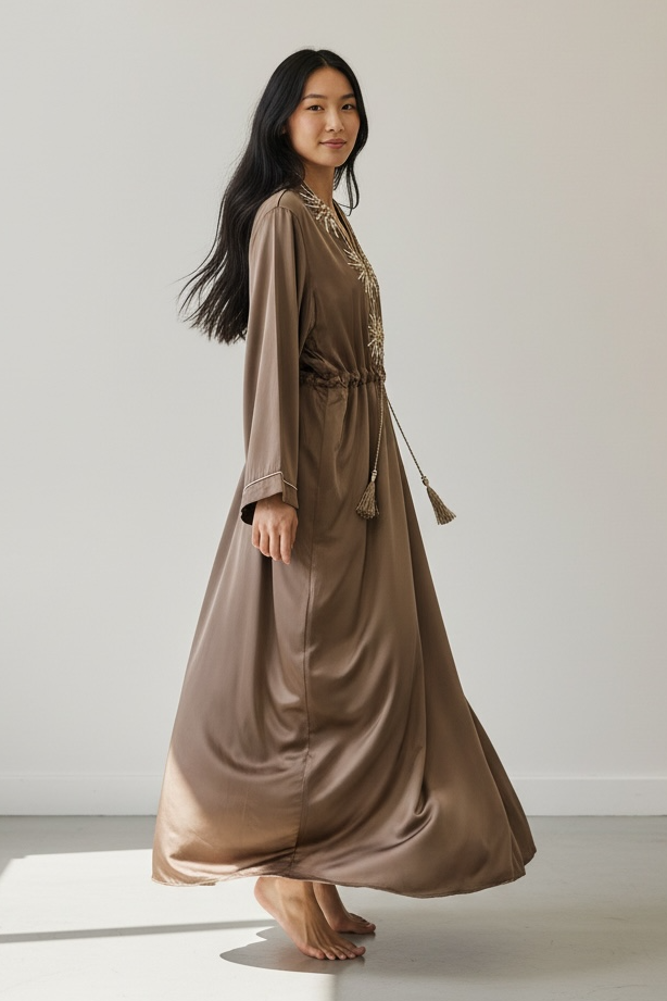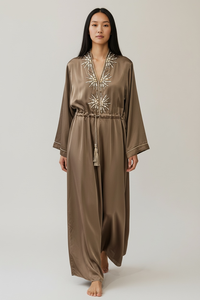 Charizma - Μάξι Καφτάνι Φόρεμα με Διακοσμητικά Στοιχεία και Ρυθμιζόμενη Μέση Καφέ