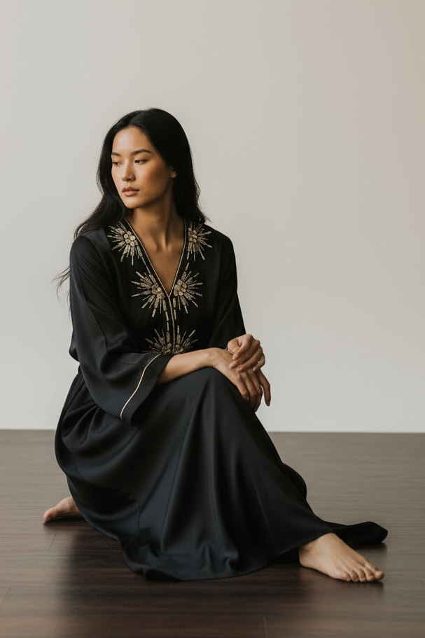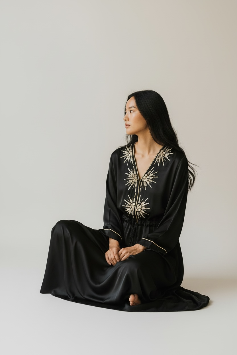 Κομψό μάξι φόρεμα με άνετη, ρευστή γραμμή που συνδυάζει άψογα την άνεση με την εντυπωσιακή εμφάνιση. Το επάνω μέρος διακοσμείται με εντυπωσιακά διακοσμητικά στοιχεία και ραμμένα στρας, τοποθετημένα συμμετρικά στο μπροστινό μέρος, προσθέτοντας λάμψη και χαρακτήρα στο σχέδιο. Διαθέτει κορδόνι στη μέση με φούντες, που επιτρέπει τη ρύθμιση της εφαρμογής και αναδεικνύει τη σιλουέτα. Τα μακριά μανίκια και το ανάλαφρο ύφασμα το καθιστούν ιδανική επιλογή για ιδιαίτερες εμφανίσεις, βραδινές εξόδους ή elegant resort looks. Ταιριάζει σε διαφορετικούς σωματότυπους και φοριέται με ευκολία.