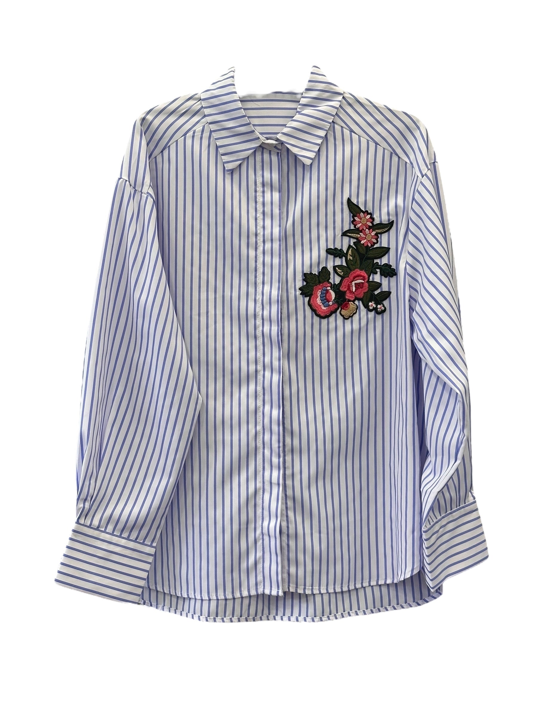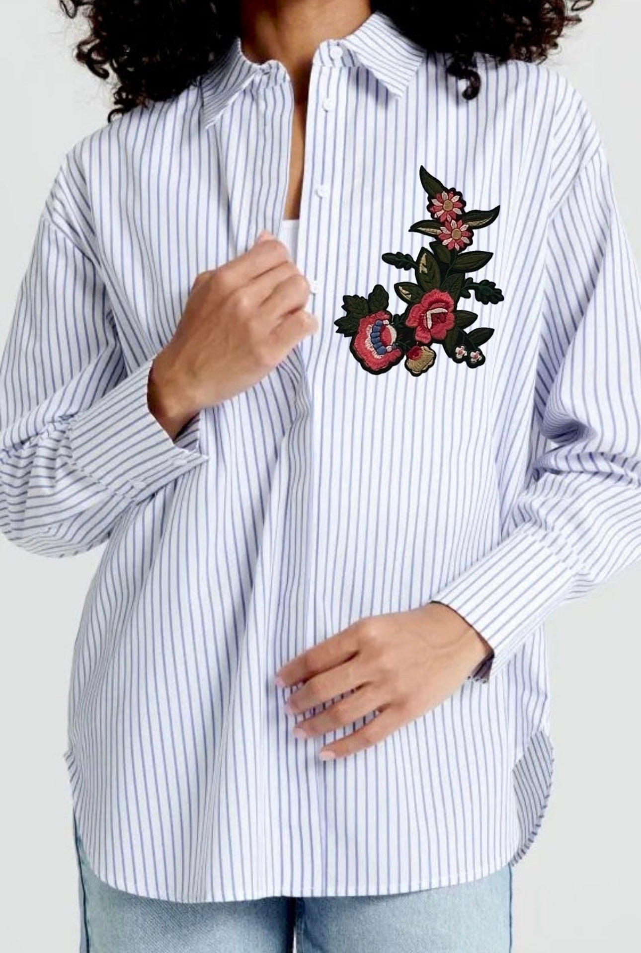 Γυναικείο Πουκάμισο Ριγέ Oversized Λευκό με Μπλε Ρίγες και κέντημα στο στήθος.