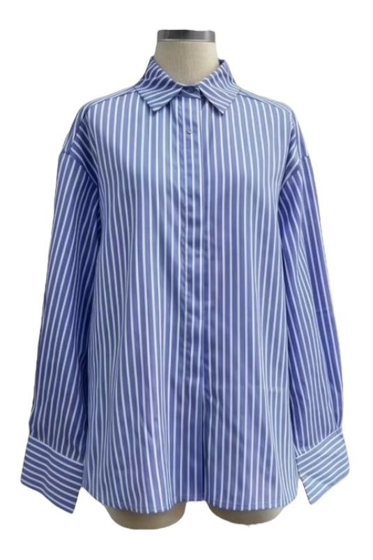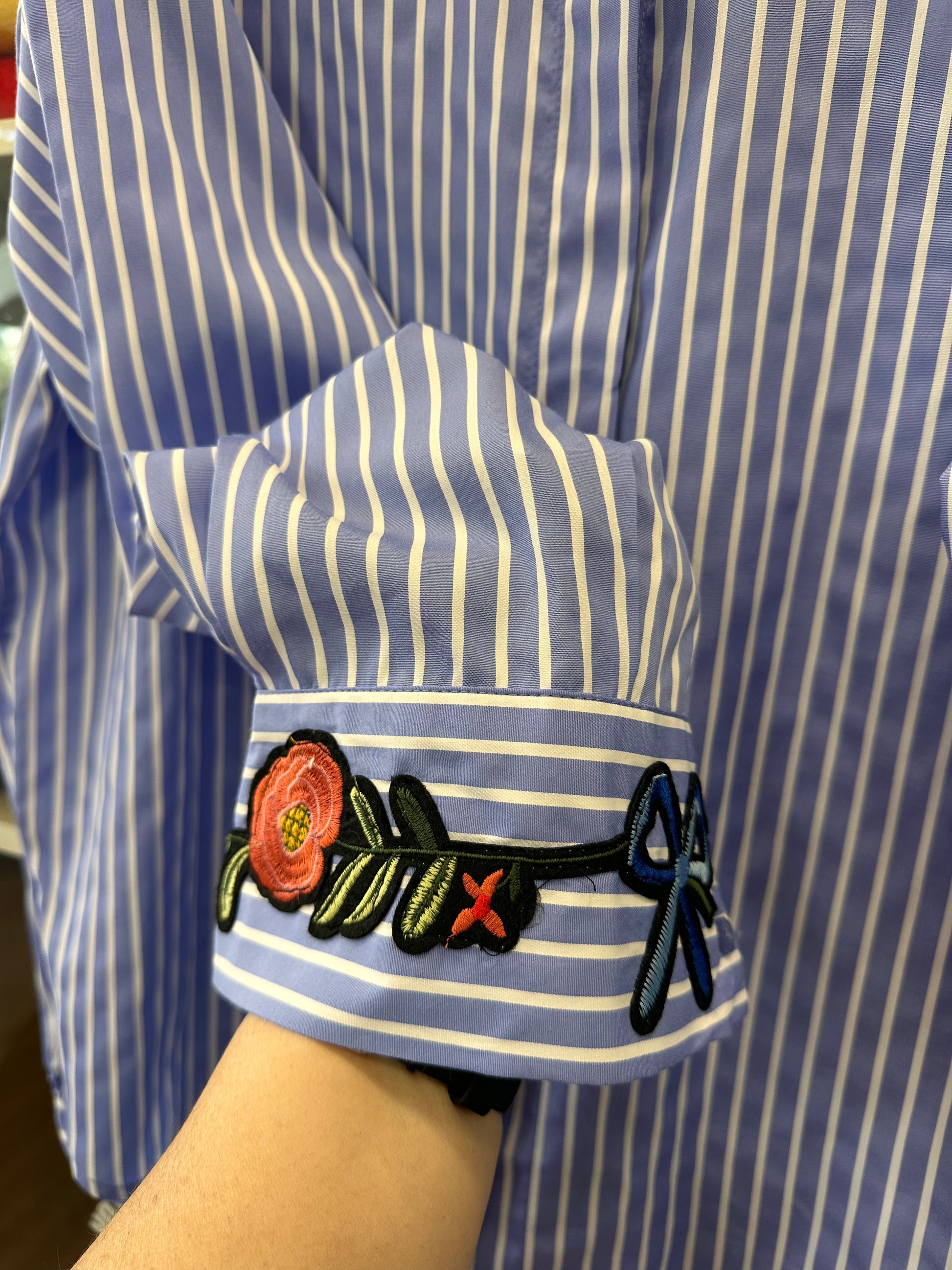 Γυναικείο Πουκάμισο Ριγέ Oversized Μπλε με Λευκές Ρίγες κέντημα στο γιακά και στη μανσέτα.