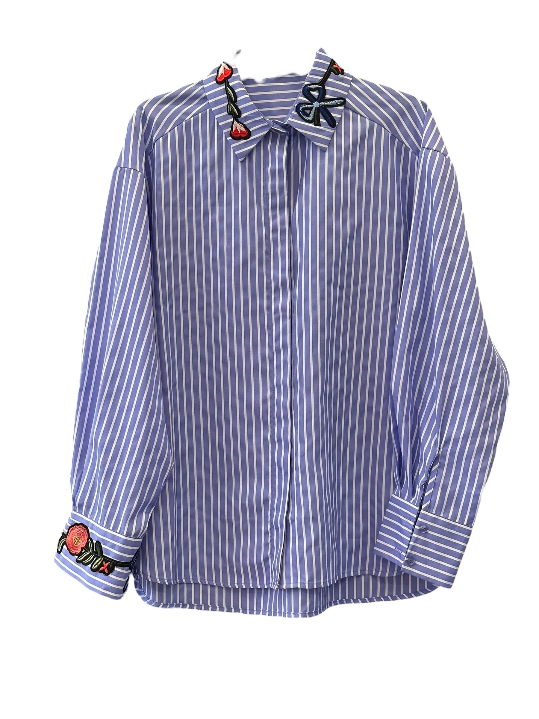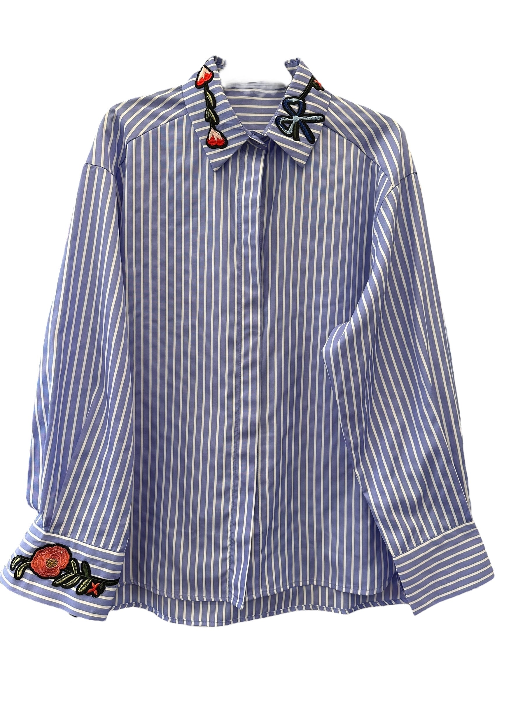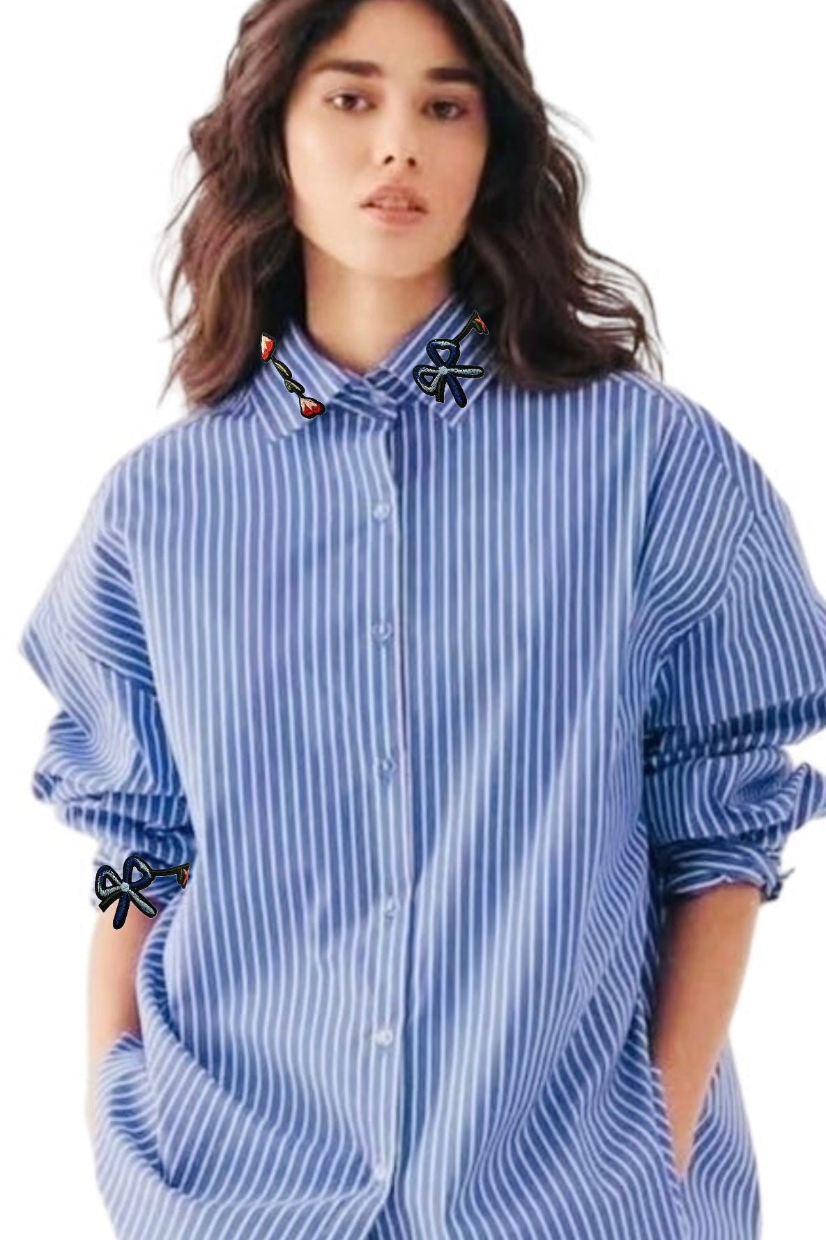 ANLYTA - Πουκάμισο Μπλε Ριγέ Oversized Με Κέντημα Στον Γιακά