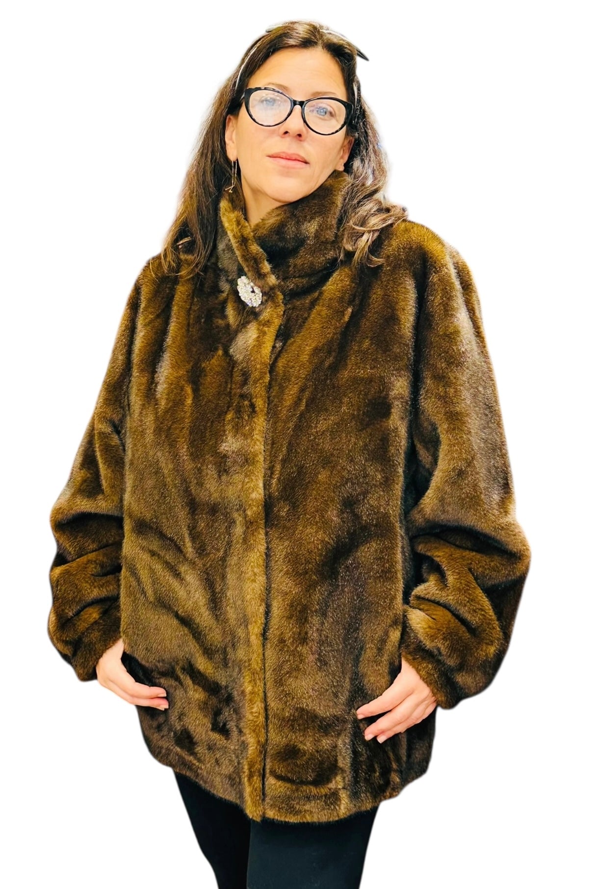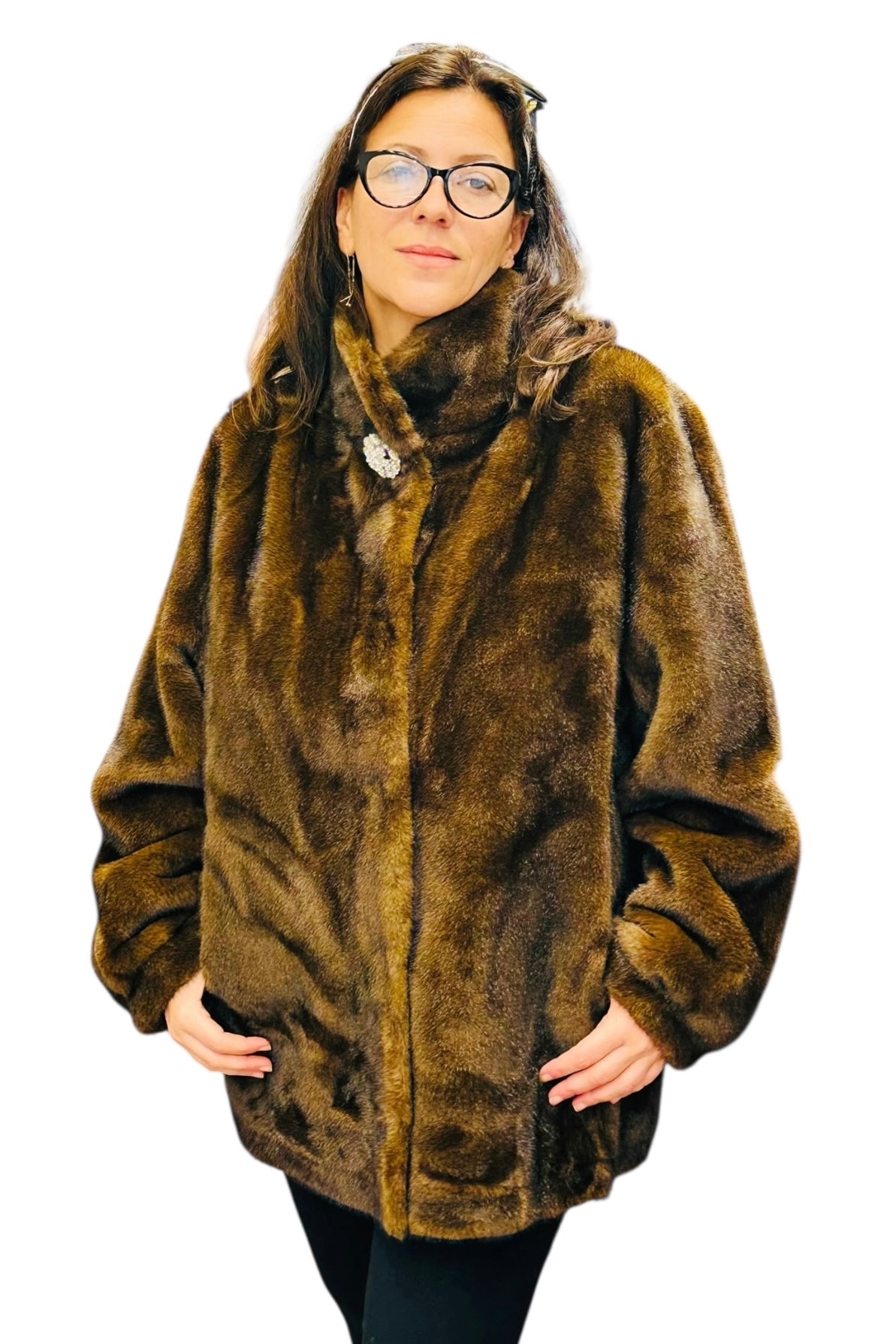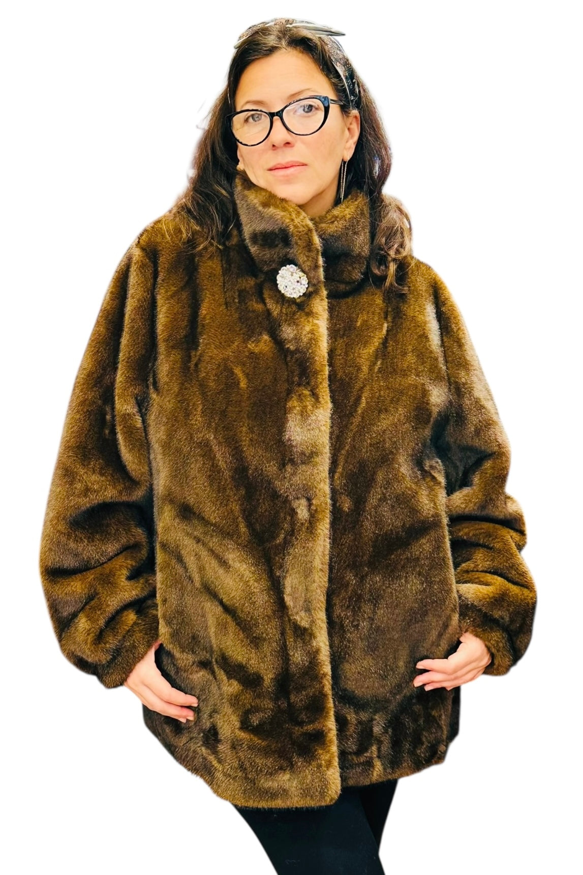 Charizma - Συνθετική Γούνα με Ψηλό Γιακά, Τσέπες & Στρασένιο Κουμπί στον Λαιμό Καφέ