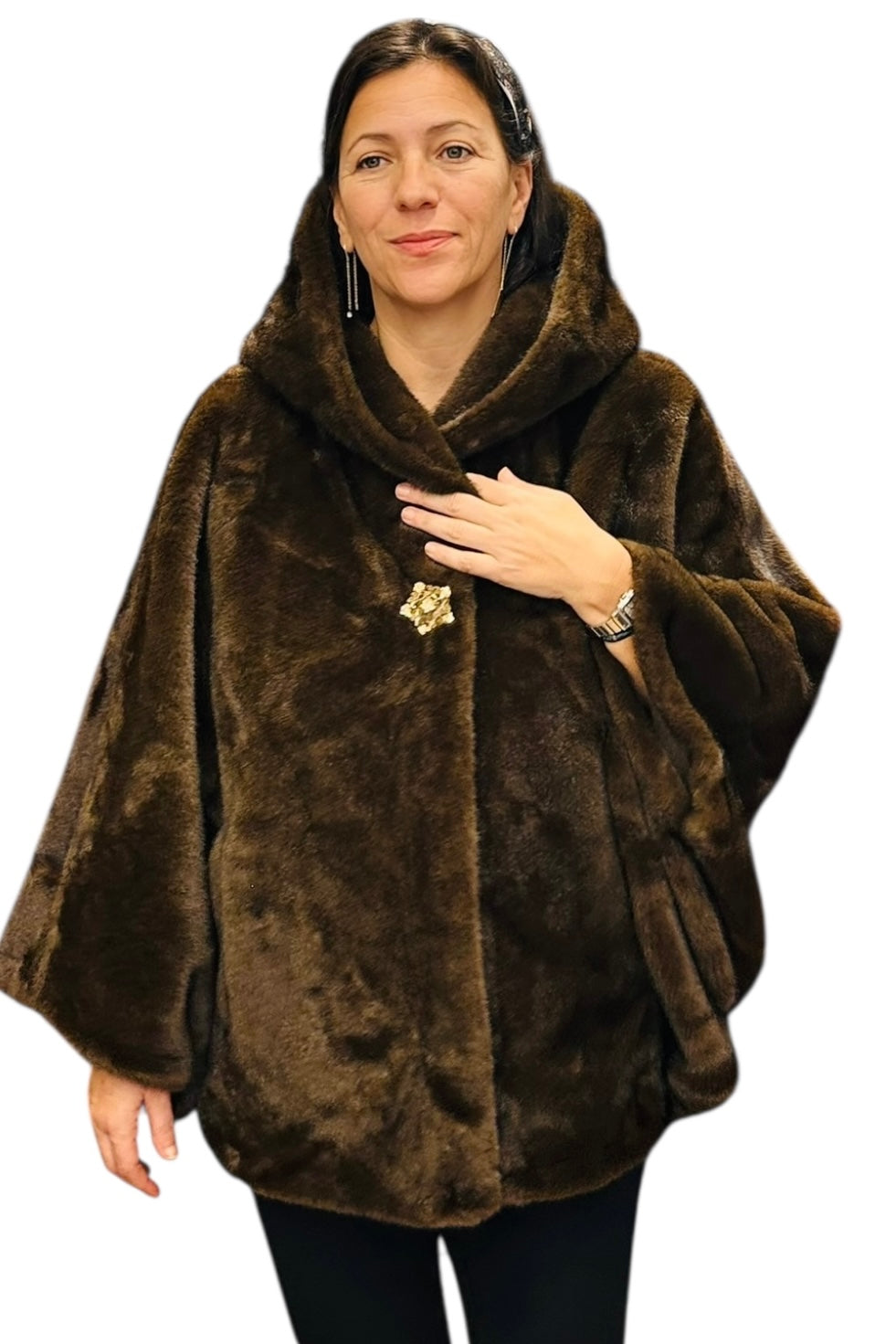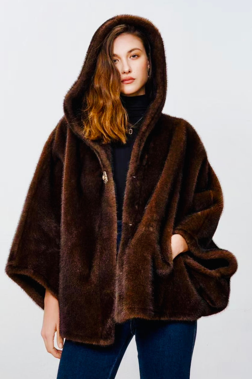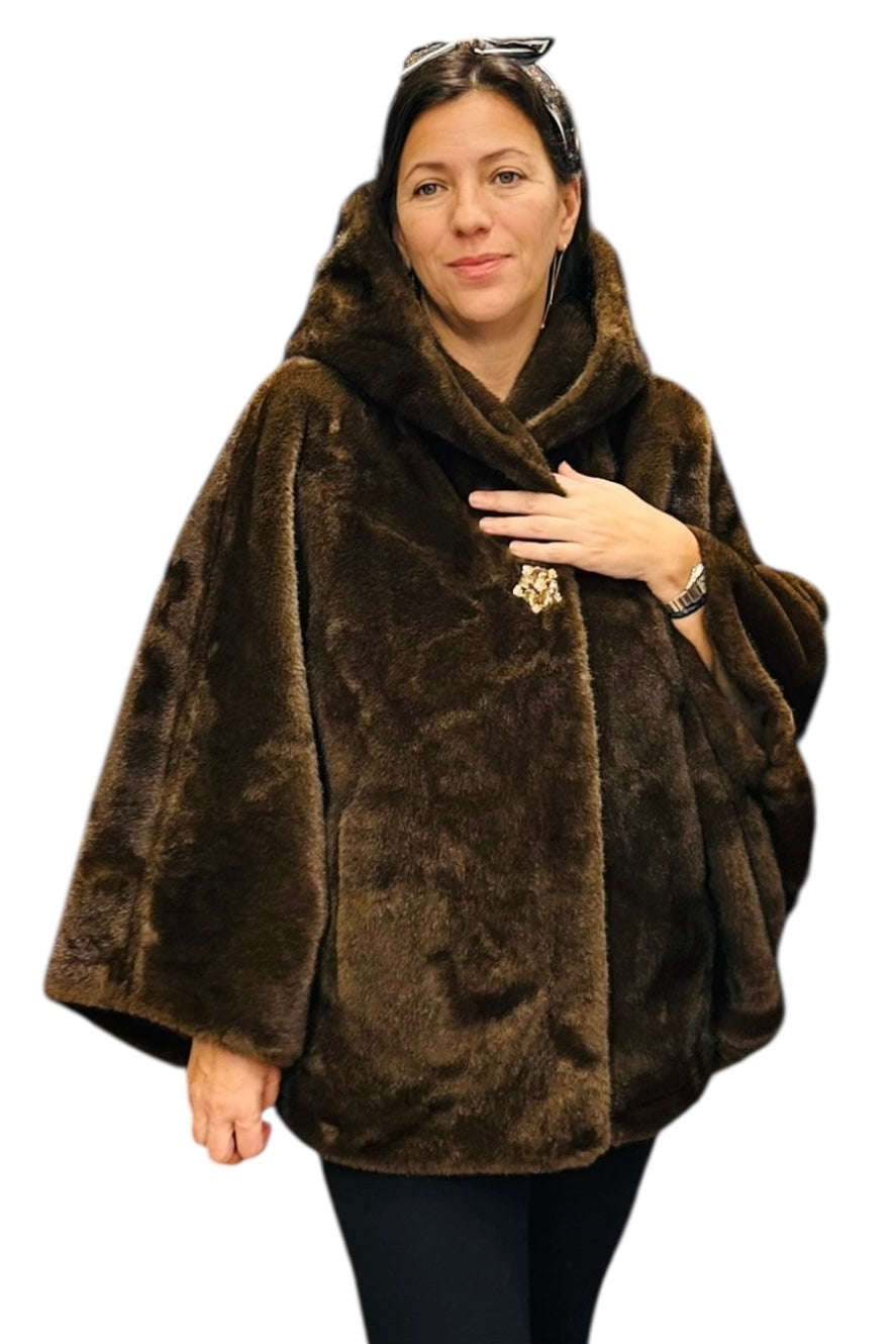 Charizma - Συνθετική Γούνα με Κουκούλα, Τσέπες σε Στυλ Κάπας Καφέ