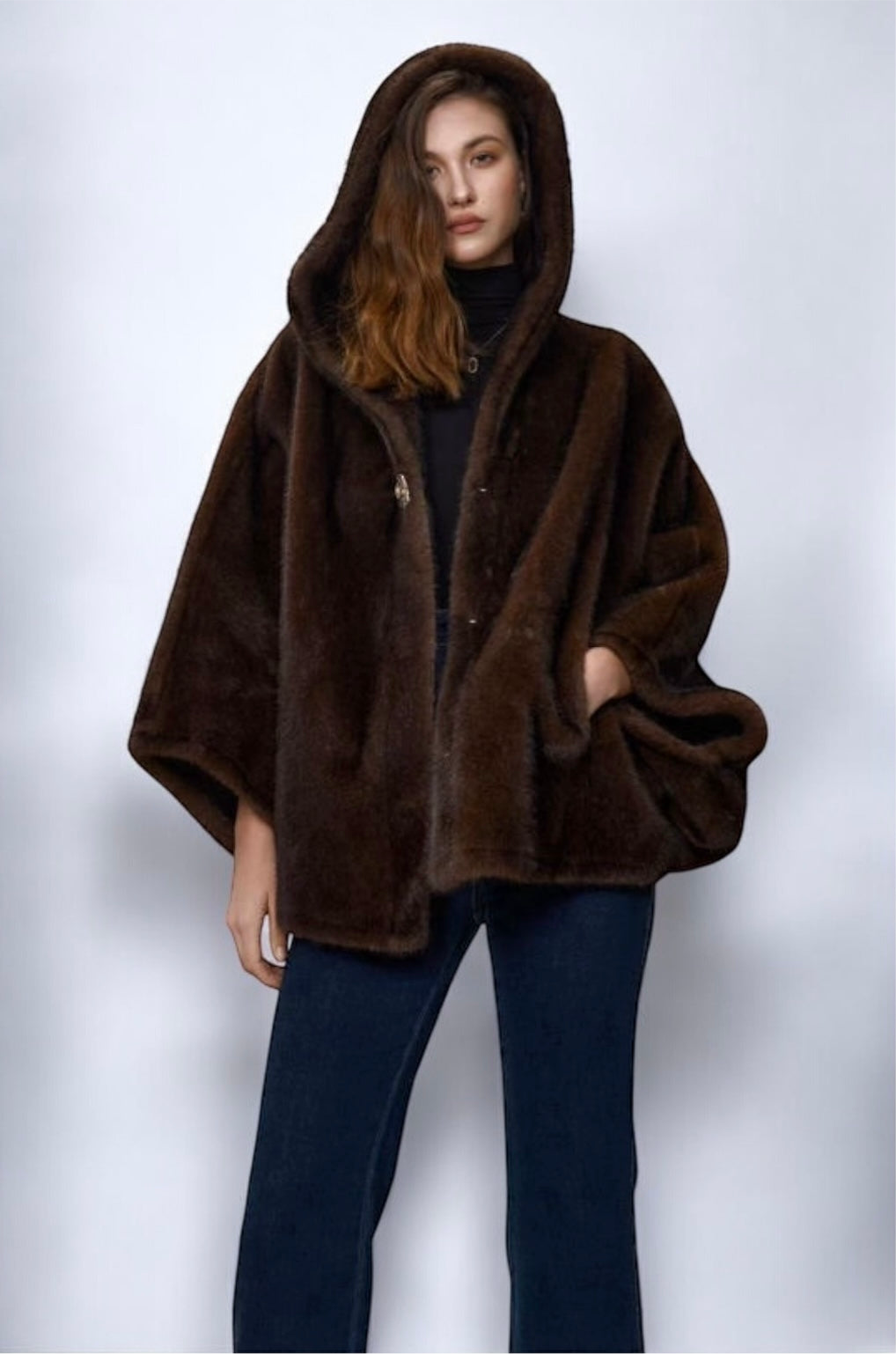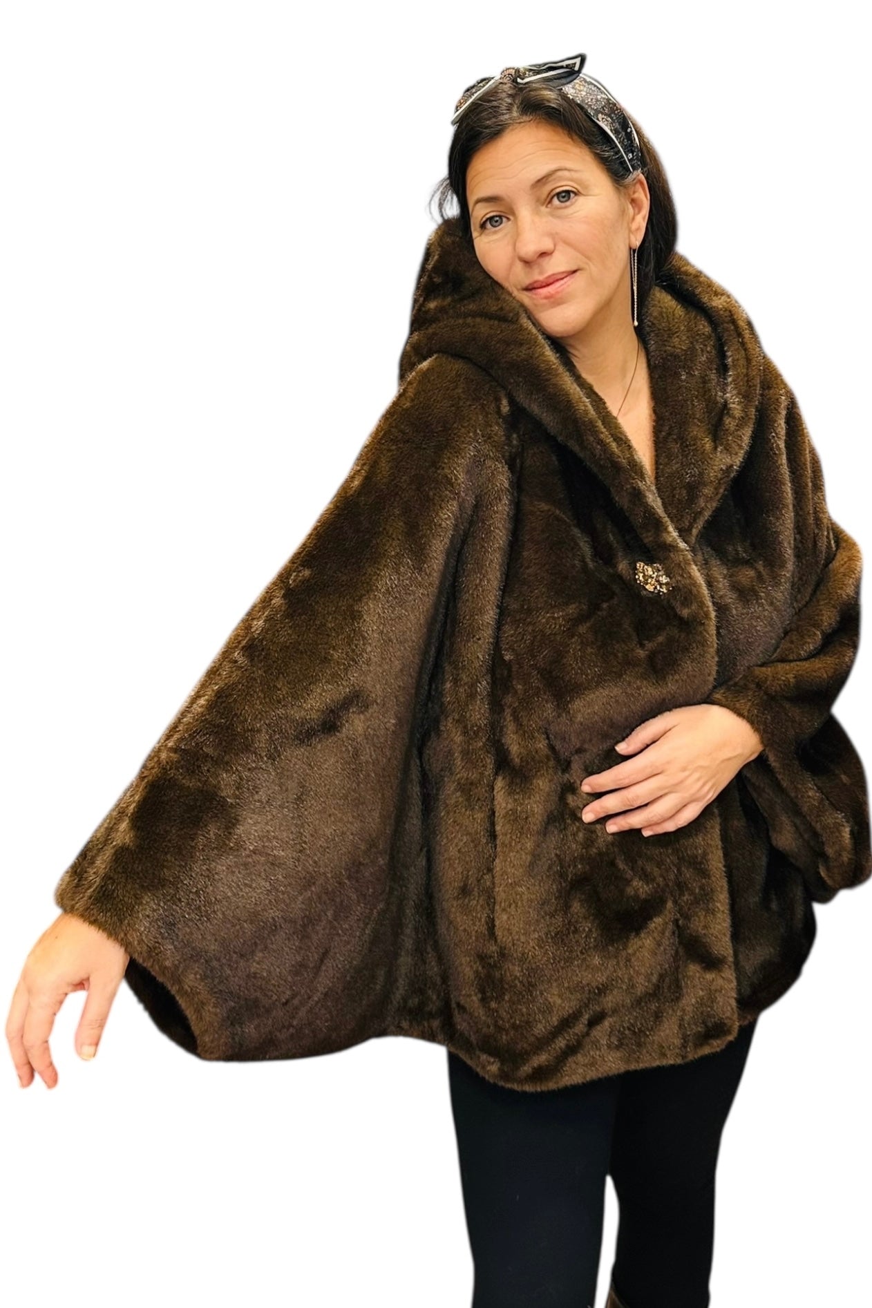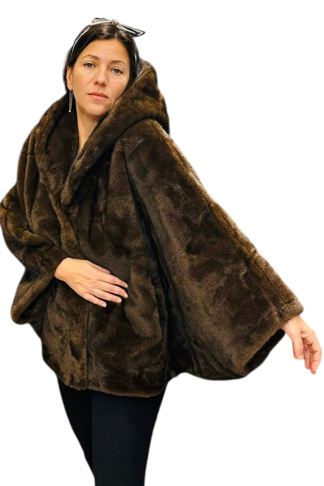 Charizma - Συνθετική Γούνα με Κουκούλα, Τσέπες σε Στυλ Κάπας Καφέ