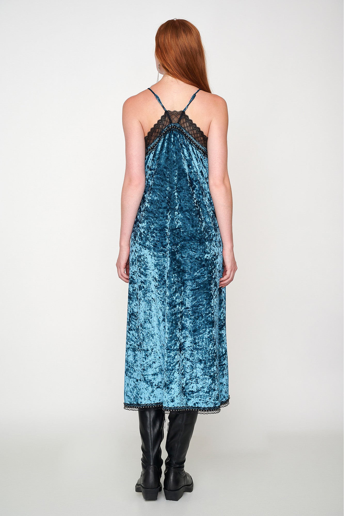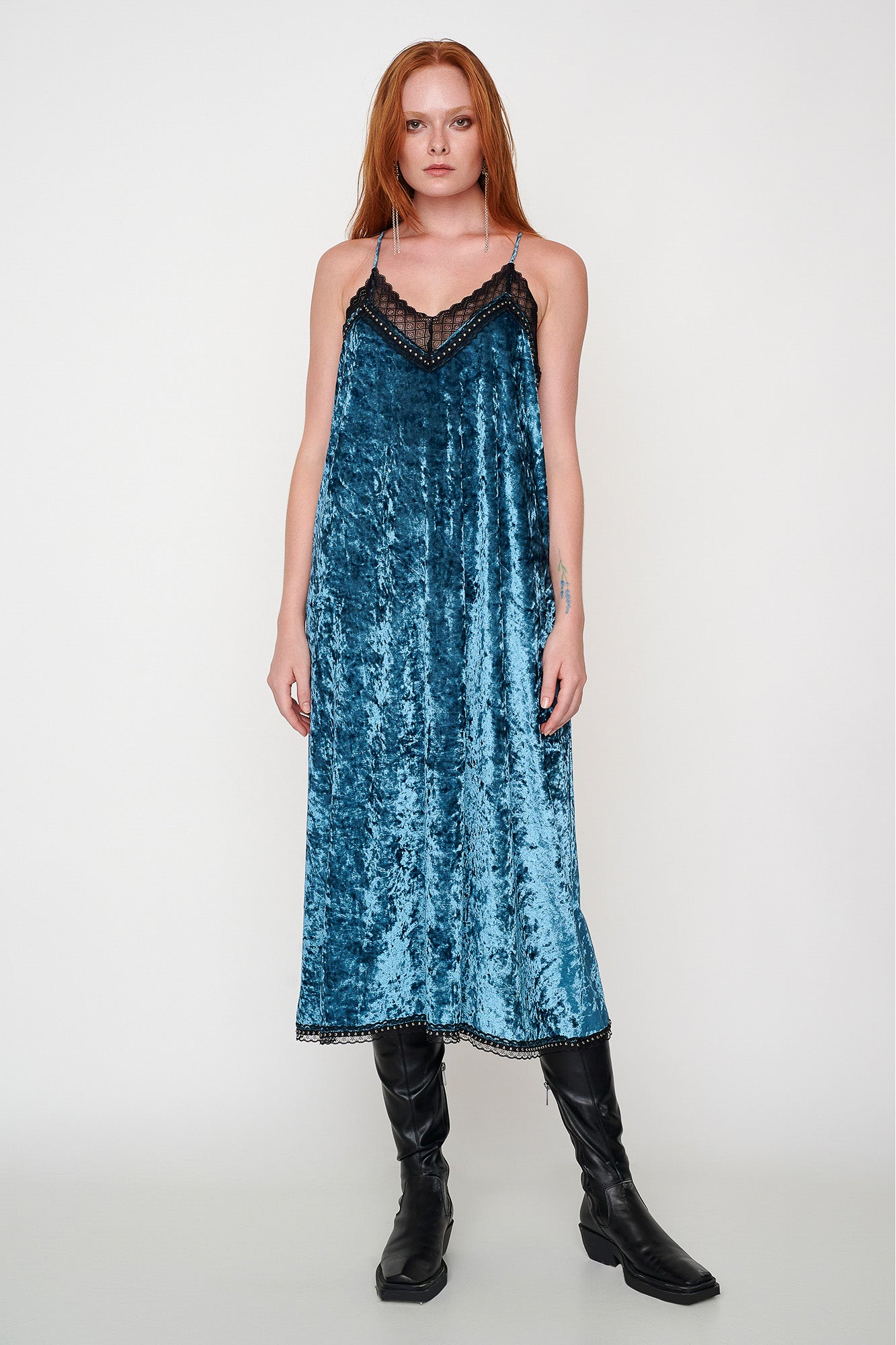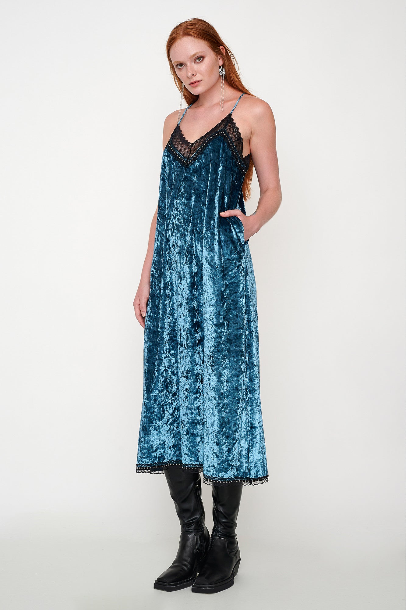 Διαχρονικά κολακευτικό και τόσο θηλυκό, αυτό το βελούδινο slip φόρεμα παρουσιάζεται σε μια ακαθόριστης μορφής σιλουέτα, μάξι-μήκος με βαθιά λαιμόκοψη σε V, λεπτομέρειες με διακοσμητικά μεταλλικά στοιχεία γύρω-γύρω, σχέδιο δαντέλας και ρυθμιζόμενο λεπτό λουράκι ώμου. Ένα διαχρονικό και απαραίτητο κομμάτι για την γκαρνταρόμπα σας, αυτό το slip φόρεμα μπορεί να φορεθεί σε επίσημες αλλά και πιο casual περιστάσεις.